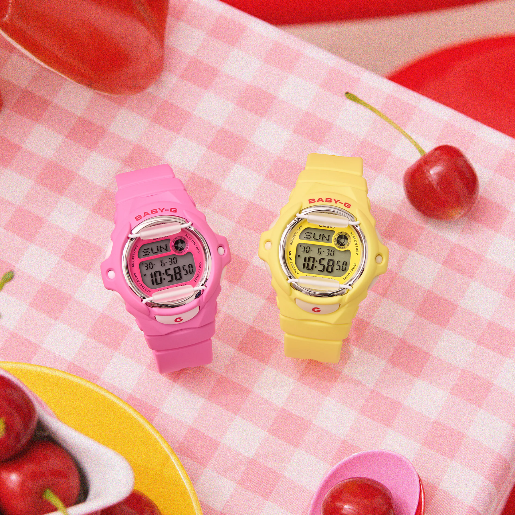 The Casio Baby-G BG-169CH-9DR Digital Yellow Women Watch is a playful yet practical timepiece featuring a compact round case and face protectors. Designed in bright yellow with subtle cherry-red accents, it reveals a whimsical cherry design when the light button is pressed. Built with shock resistance and 200-meter water resistance, it also offers world time, stopwatch, countdown timer, 5 alarms, and Telememo memory—delivering a colorful mix of fun and everyday functionality.