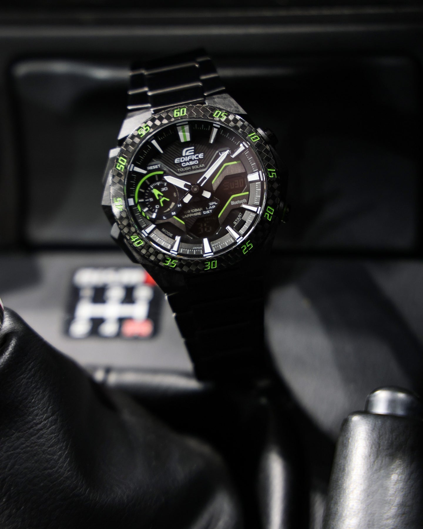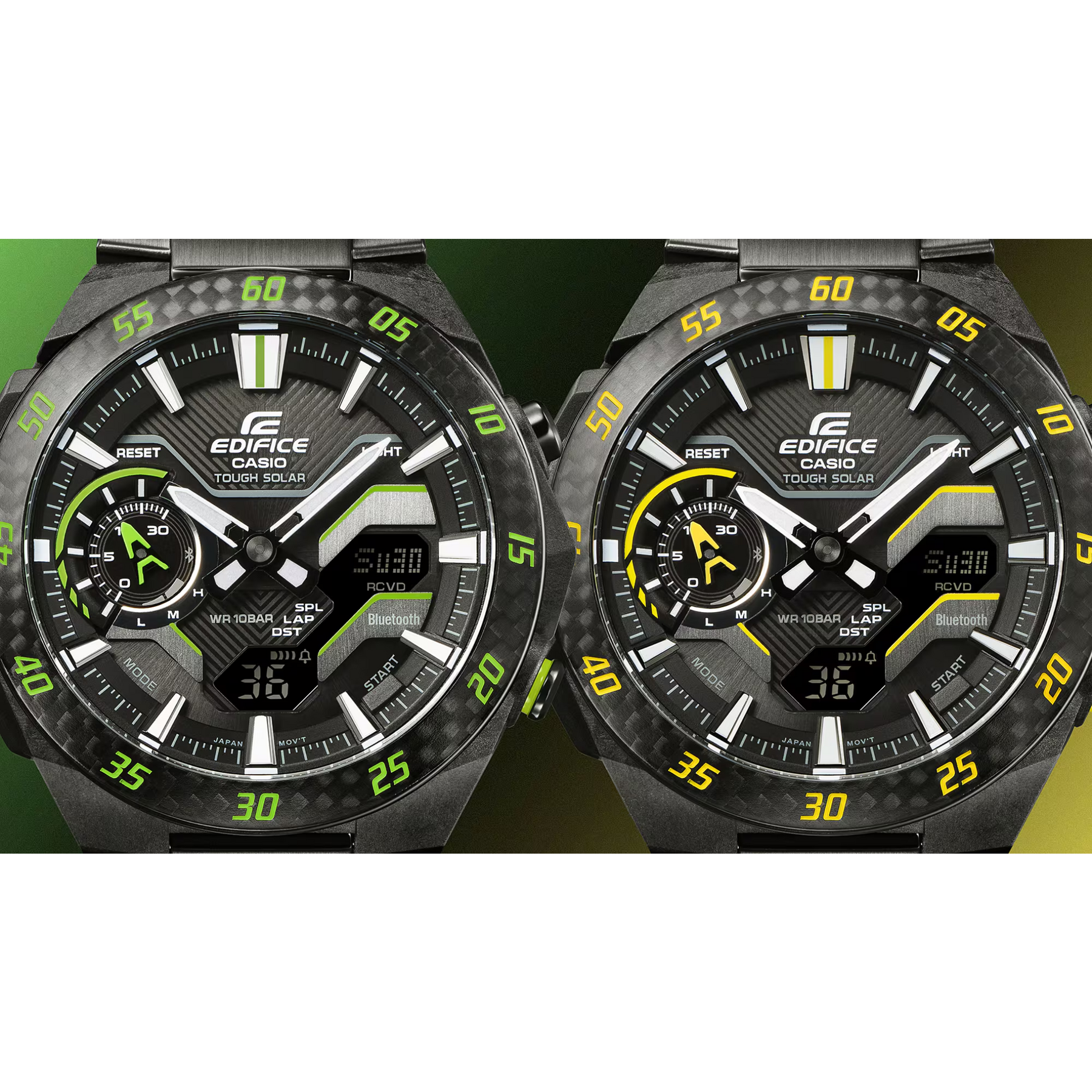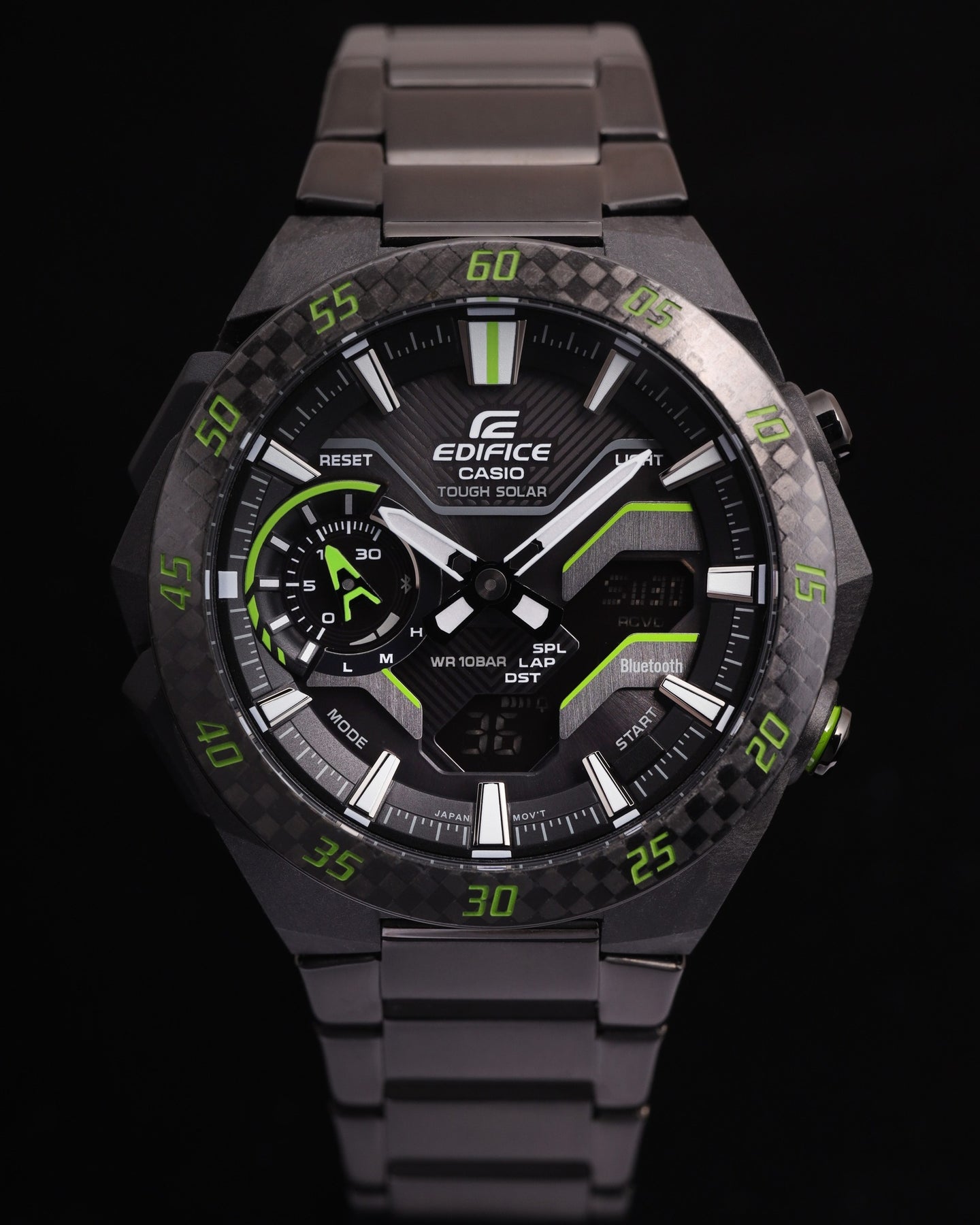 The Casio Edifice ECB-2200RC-1A3DF Windflow Men Watch delivers high-performance motorsport styling with a carbon fiber-reinforced resin case, carbon fiber bezel, and black ion-plated stainless steel band accented in racing-inspired green. Powered by Tough Solar, it connects via Bluetooth® Smartphone Link for automatic time adjustment, world time in over 300 cities, and stopwatch data transfer. Additional features include a Super Illuminator double LED light, countdown timer, and 100-meter water resistance for everyday reliability.