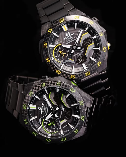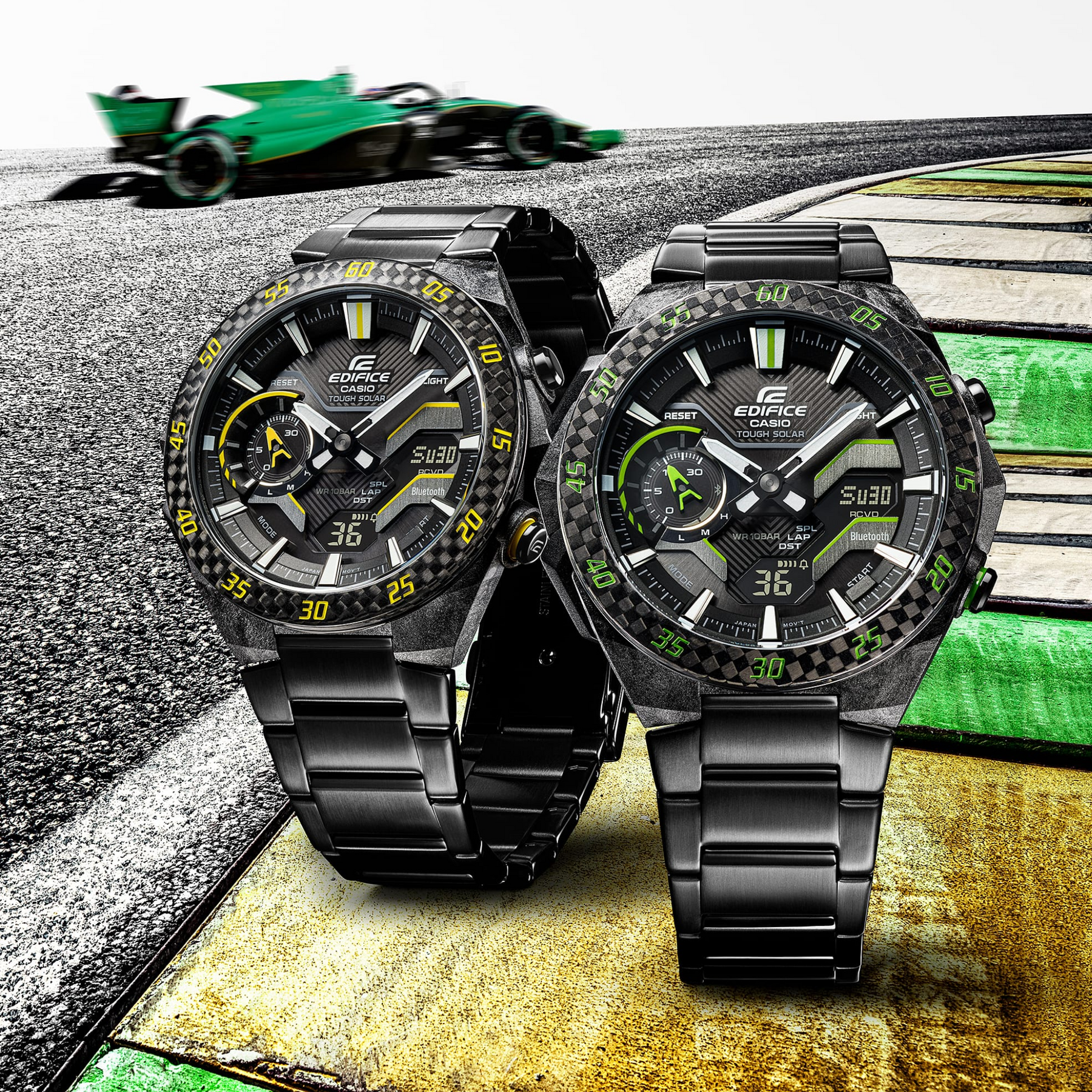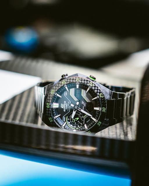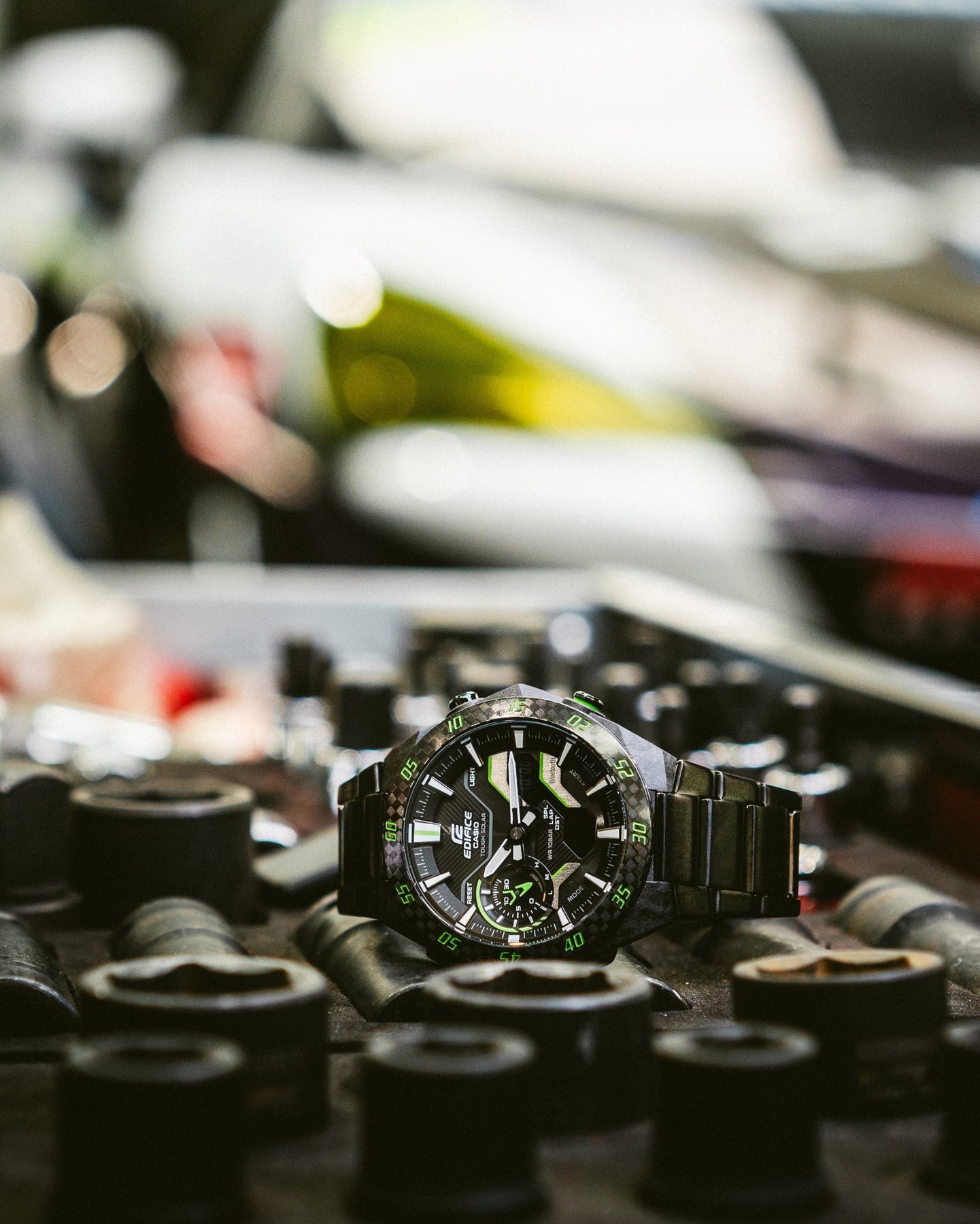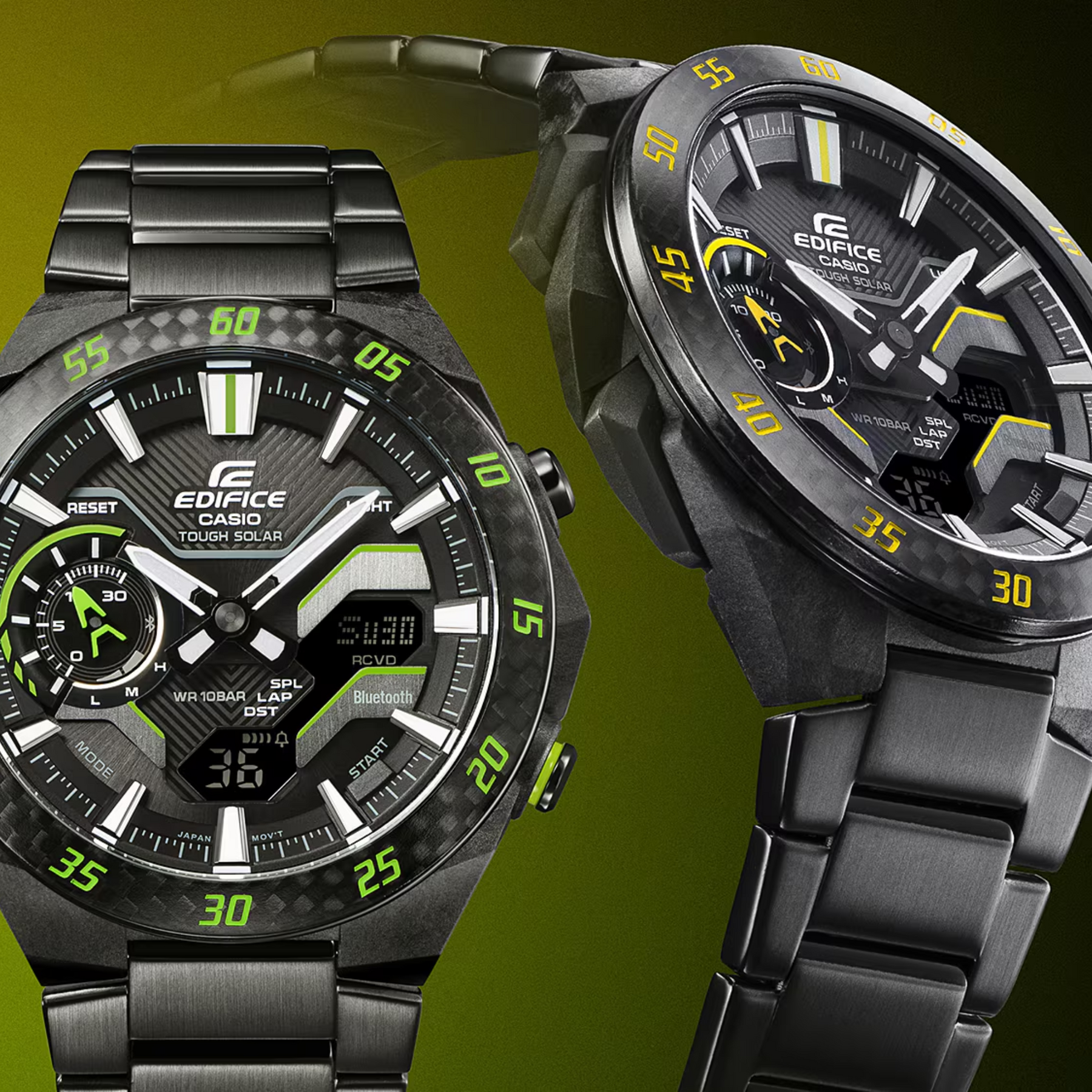 The Casio Edifice ECB-2200RC-1A3DF Windflow Men Watch delivers high-performance motorsport styling with a carbon fiber-reinforced resin case, carbon fiber bezel, and black ion-plated stainless steel band accented in racing-inspired green. Powered by Tough Solar, it connects via Bluetooth® Smartphone Link for automatic time adjustment, world time in over 300 cities, and stopwatch data transfer. Additional features include a Super Illuminator double LED light, countdown timer, and 100-meter water resistance for everyday reliability.
