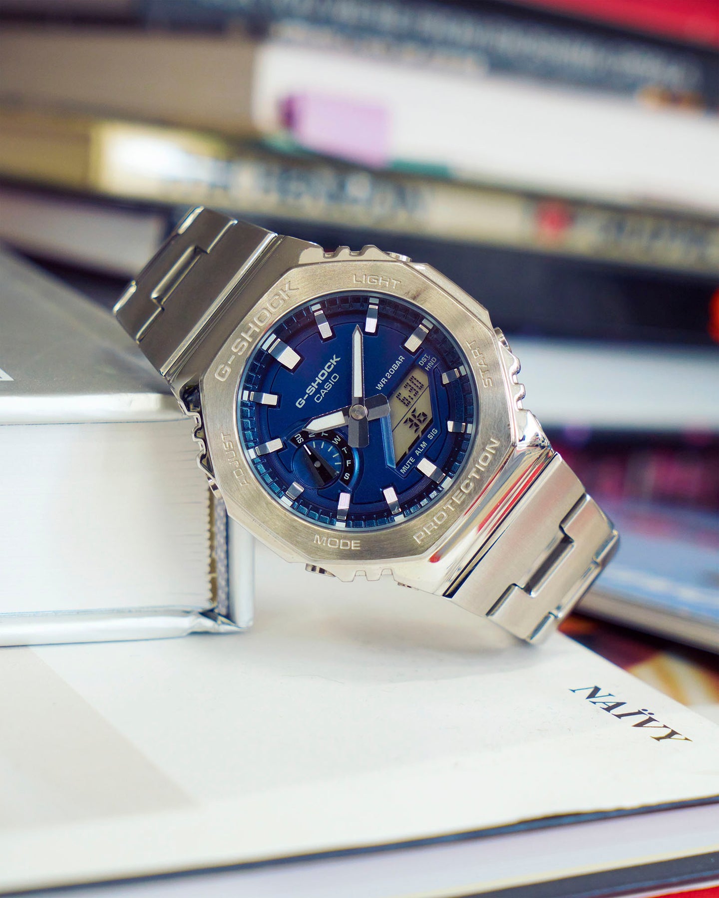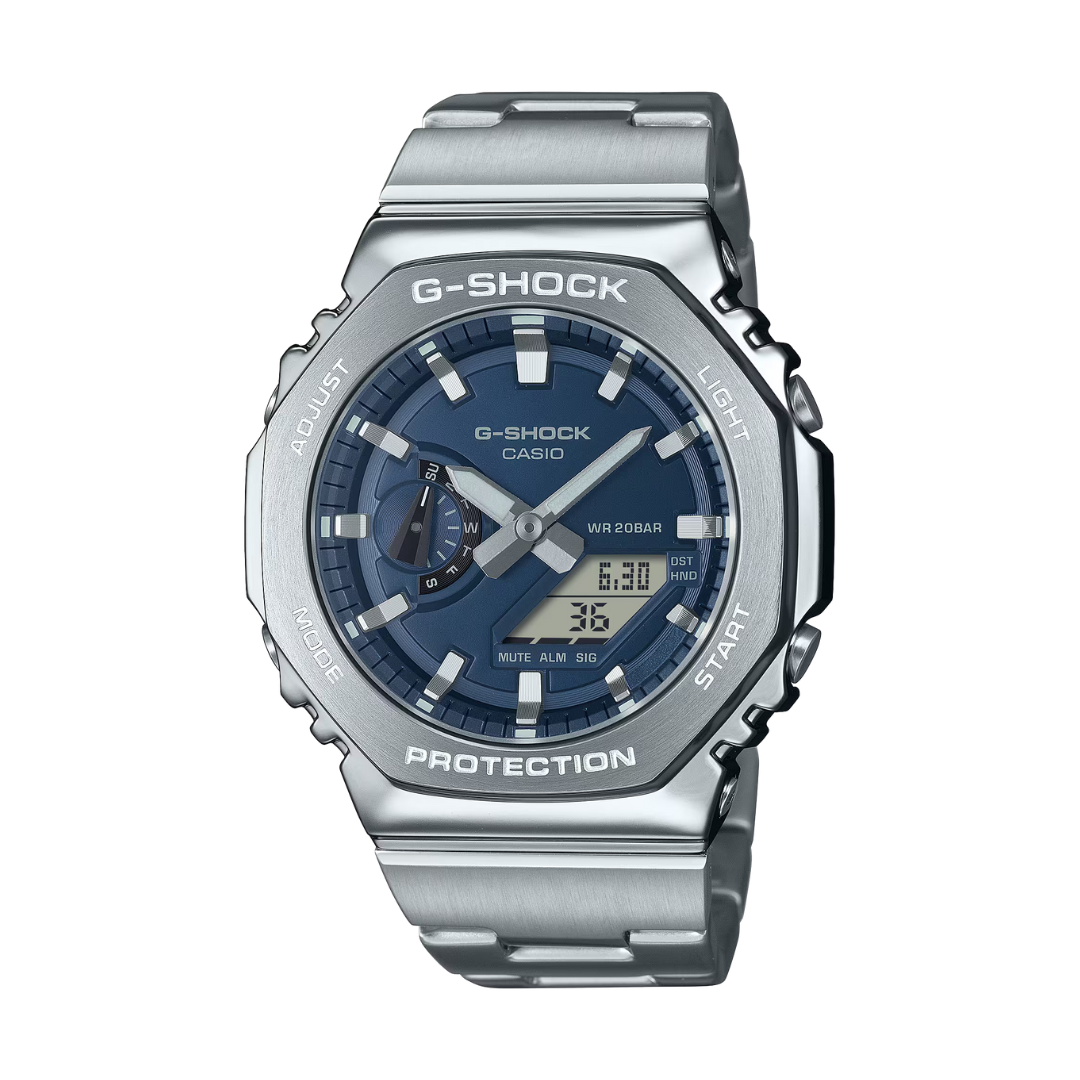 The Casio G-SHOCK G-STEEL GM-2110D-2BDR is a robust and stylish men's watch designed for durability and performance. Featuring a navy blue metallic dial with a stainless steel case and band, this watch combines classic aesthetics with modern functionality. The shock-resistant structure and 200-meter water resistance make it suitable for various activities, while the double LED light ensures visibility in low-light conditions. With its slim profile and sophisticated design, the GM-2110D-2BDR is perfect for both casual and formal occasions.