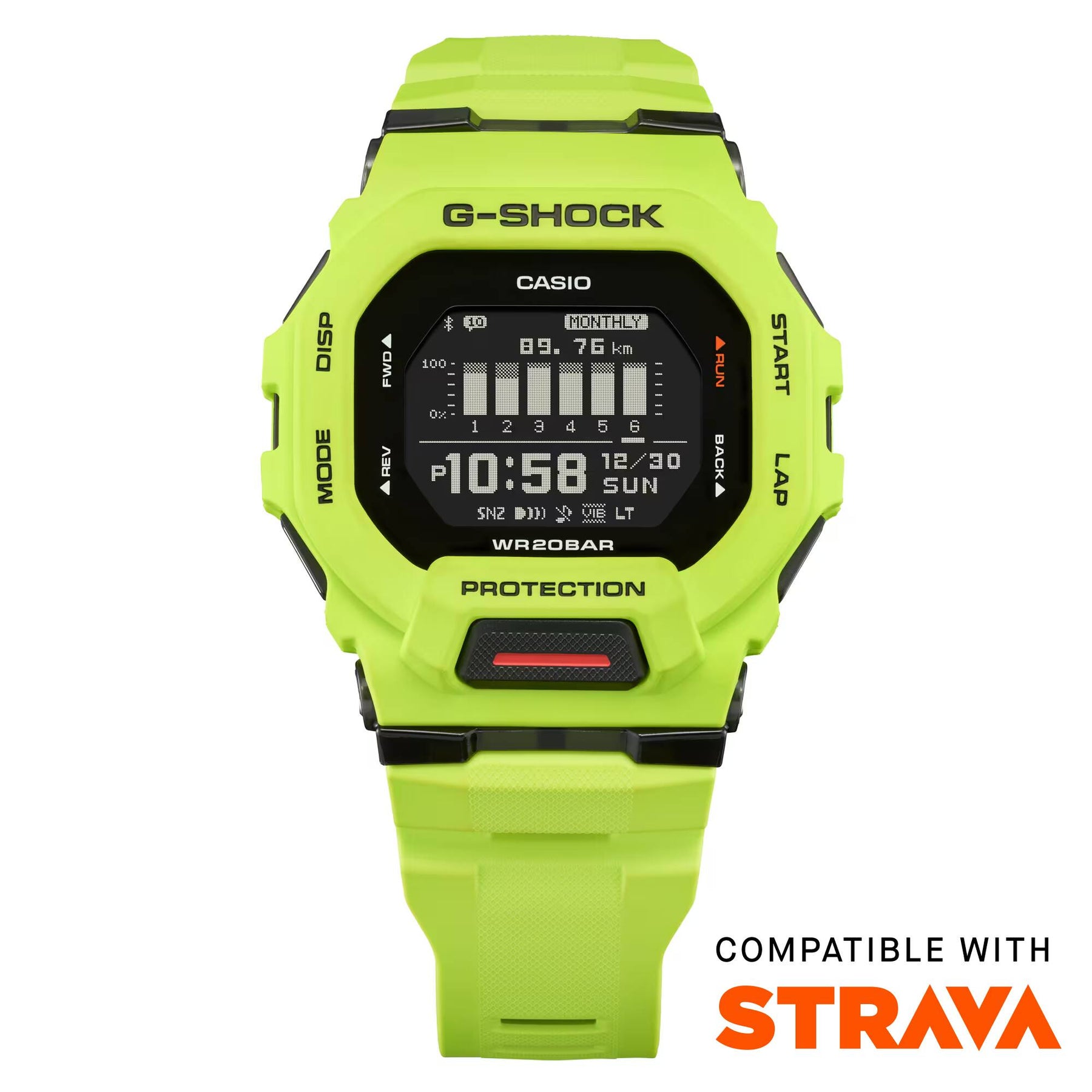 The Casio G-Shock GBD-200-9DR Sports Digital Lime Green Watch is part of the G-SQUAD line, built for athletes and fitness enthusiasts. Featuring the thinnest G-SQUAD square case design, this bold lime green model combines shock resistance and 200-meter water resistance with advanced training features. Via Bluetooth® connection, it links to your smartphone GPS for precision distance, pace, and speed tracking, plus auto lap readings, calories burned, and step counting. With interval timers, 4 alarms, vibration alerts, Super Illuminator LED light, and soft urethane strap with extra adjustment holes, it delivers complete functionality and all-day comfort for workouts and beyond.