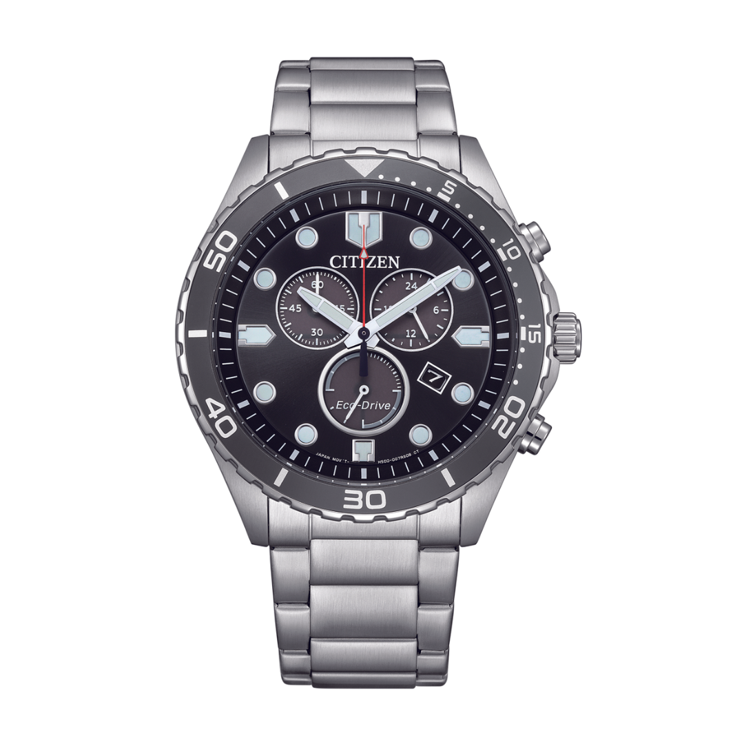 Sporty yet refined, the Citizen AT2568-82E Eco-Drive Chronograph Men Watch combines bold design with advanced technology. Featuring a 43mm stainless steel case and sleek black dial with chronograph sub-dials, it delivers both style and function. Powered by Citizen’s Eco-Drive movement, it runs on light with up to 5 months of power reserve, eliminating the need for battery replacement. With 100m water resistance, date display, and durable mineral glass, this chronograph is built for men who demand performance and reliability.