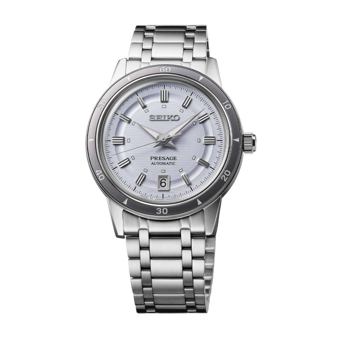 The Seiko Presage SRPL73J1 merges mid-century design with modern mechanics. Featuring a light violet dial, stainless steel case and bracelet, and box-shaped Hardlex glass, this 39.5mm automatic watch exudes subtle elegance. It runs on the reliable 4R35 movement with a 41-hour power reserve, date display, and see-through case back—ideal for those who appreciate timeless style with a unique twist.