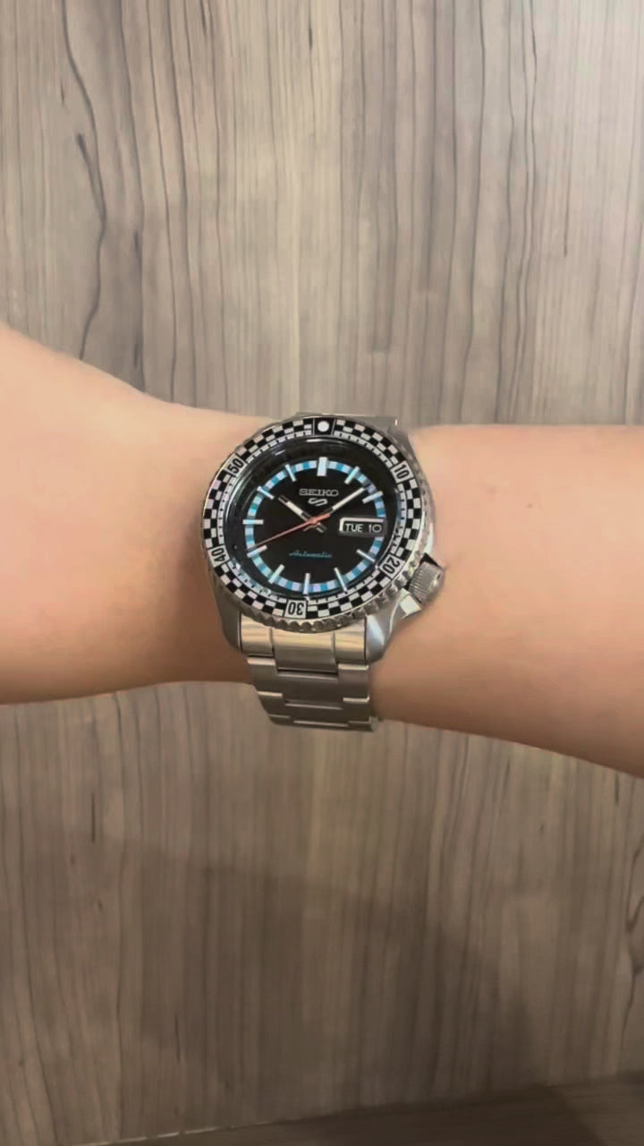 As a re-creation of the 1969 piece, this model maintains the looks and petrol blue colour scheme. It features the same dial, 60s-style hands, and checkered bezel as the original. It also pays homage to the fan-favourite Seiko 5 Sports SKX case design.