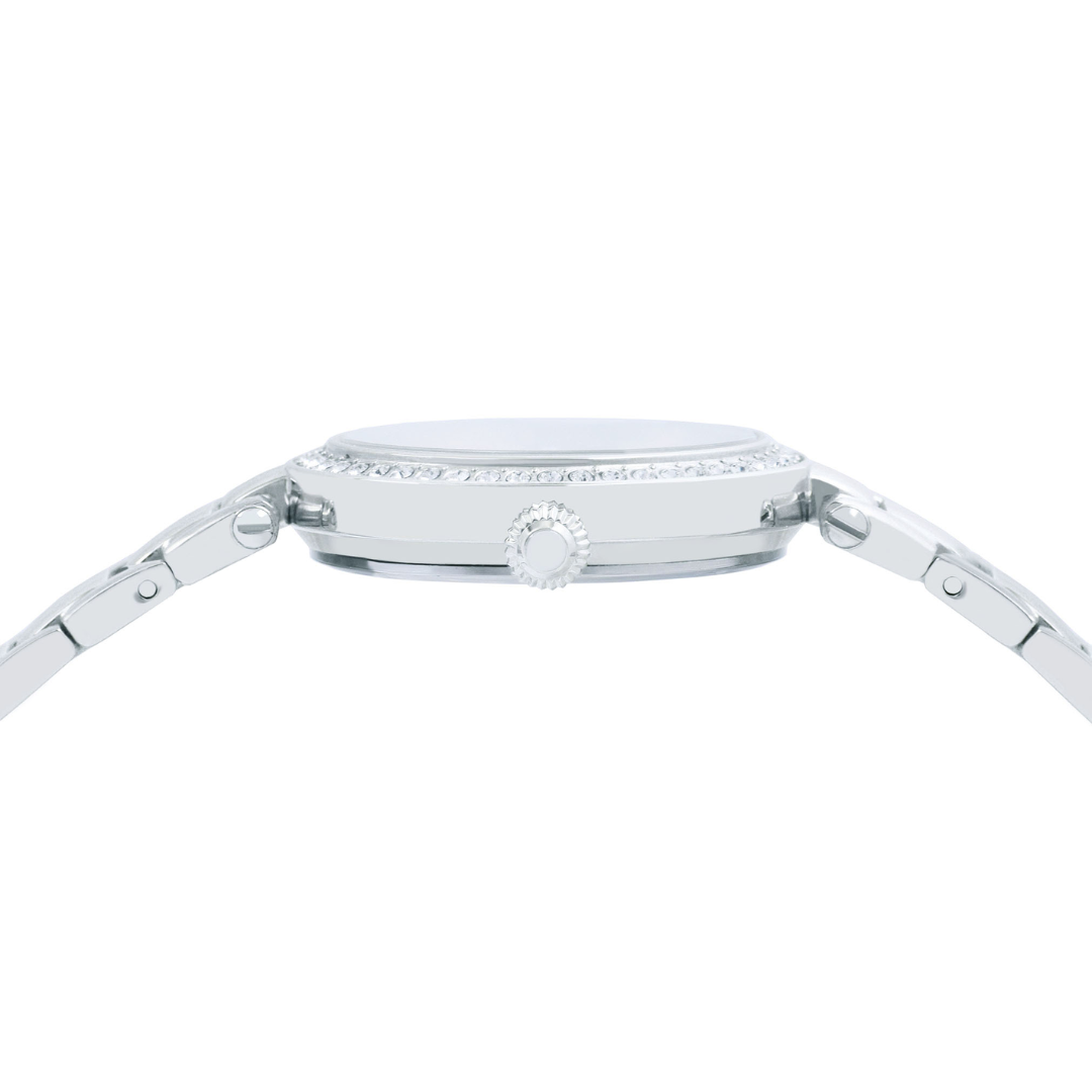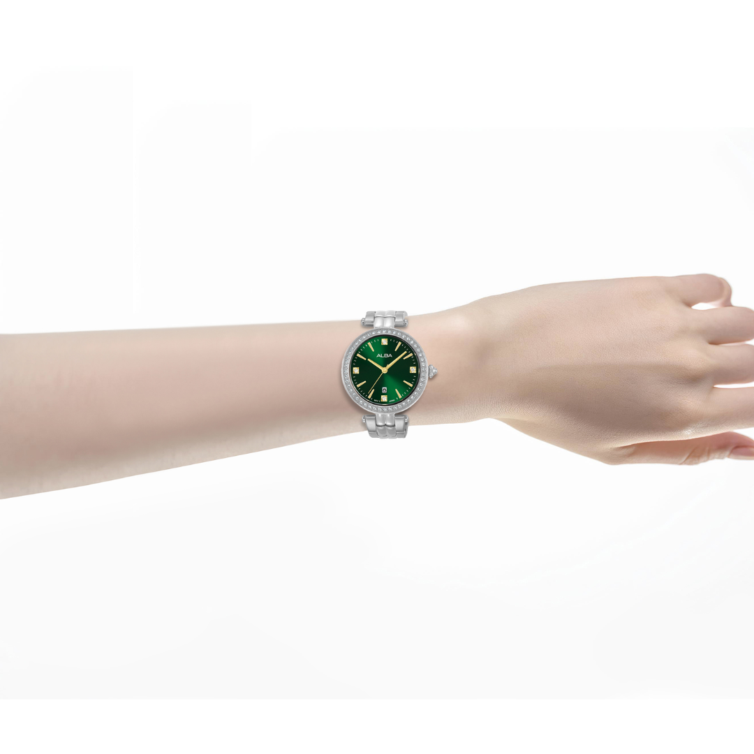 The Alba AH7EG9X Fashion Quartz Women Watch features a 31mm stainless steel case with a green dial for a soft, feminine style. Designed with a stainless steel solid bracelet, it offers date display, 3-hand timekeeping, and 5-bar water resistance. Mineral crystal glass provides durability, making it perfect for both daily wear and special occasions.