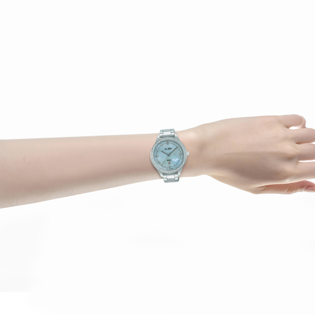 The Alba AH7EL7X Fashion Quartz Women Watch features a 33mm stainless steel case with a light blue mother-of-pearl dial for a touch of elegance. Paired with a stainless steel strap, it offers date display, 3-hand timekeeping, and 5-bar water resistance. Mineral crystal glass adds durability, making it a versatile choice for both everyday wear and formal occasions.