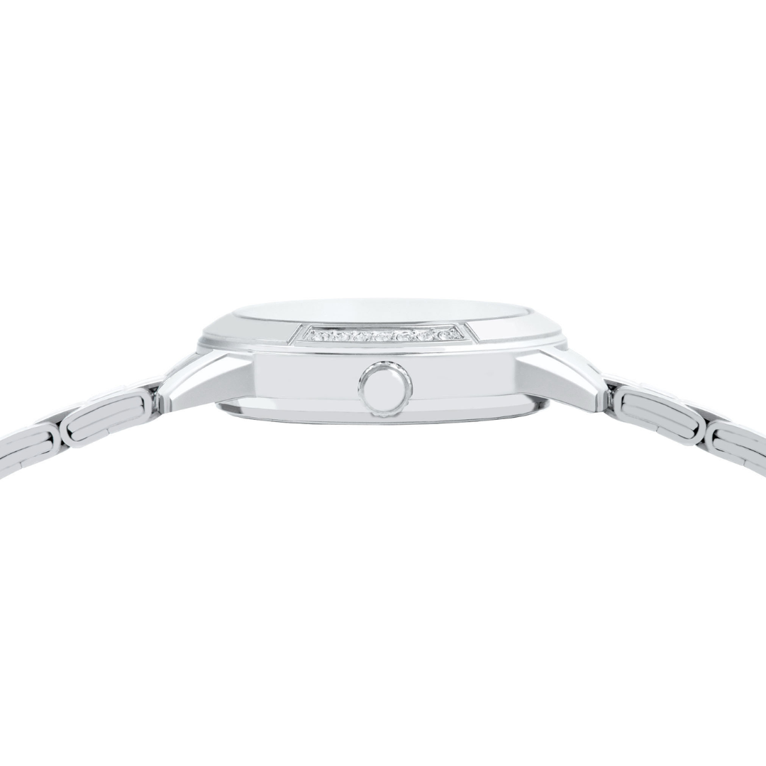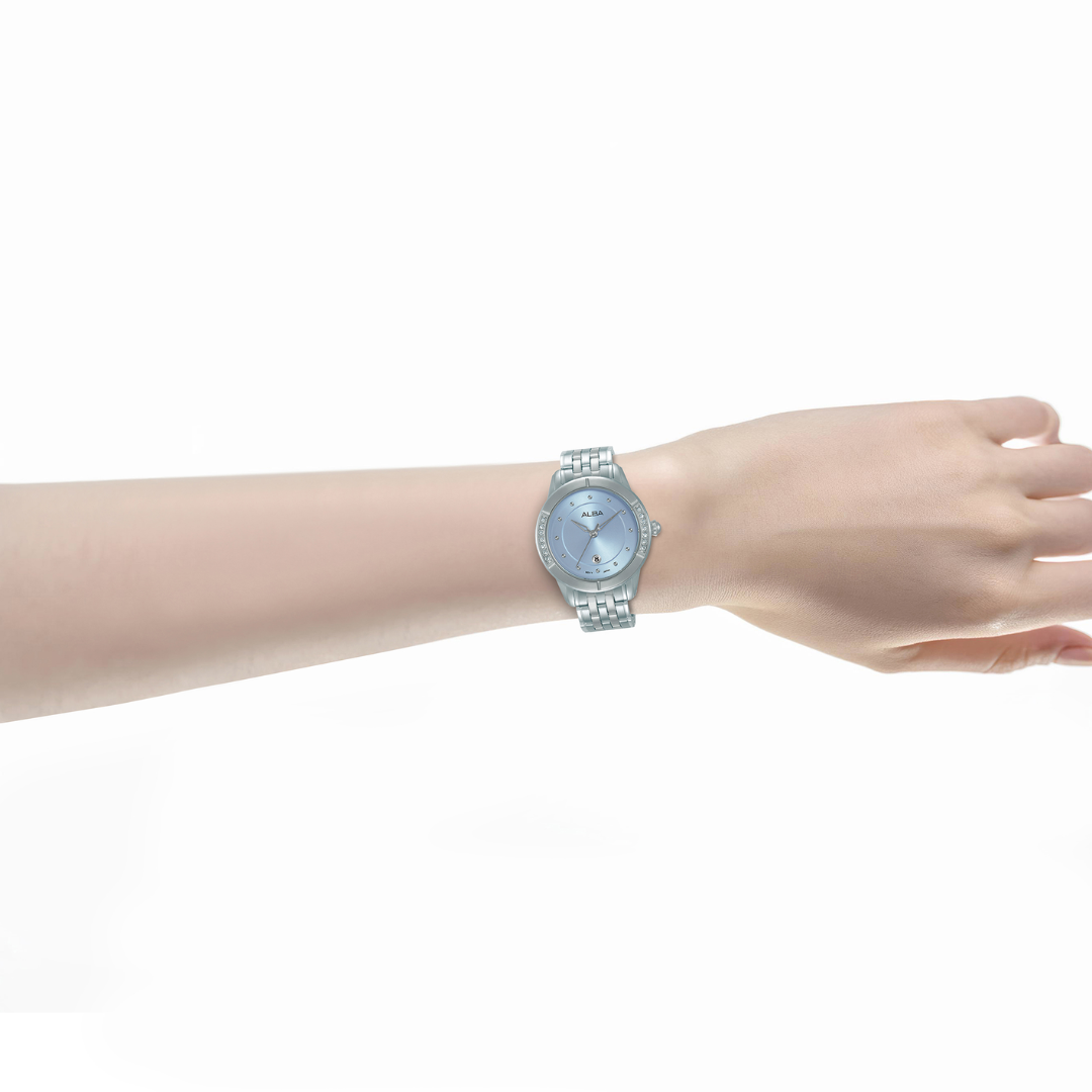The Alba AH7EN1X Fashion Quartz Women Watch showcases a 31mm stainless steel case with a light blue dial for a fresh, modern style. Featuring a stainless steel wrap bracelet, date display, and 3-hand timekeeping, it offers both elegance and practicality. With 5-bar water resistance and mineral crystal protection, this watch is perfect for everyday wear.
