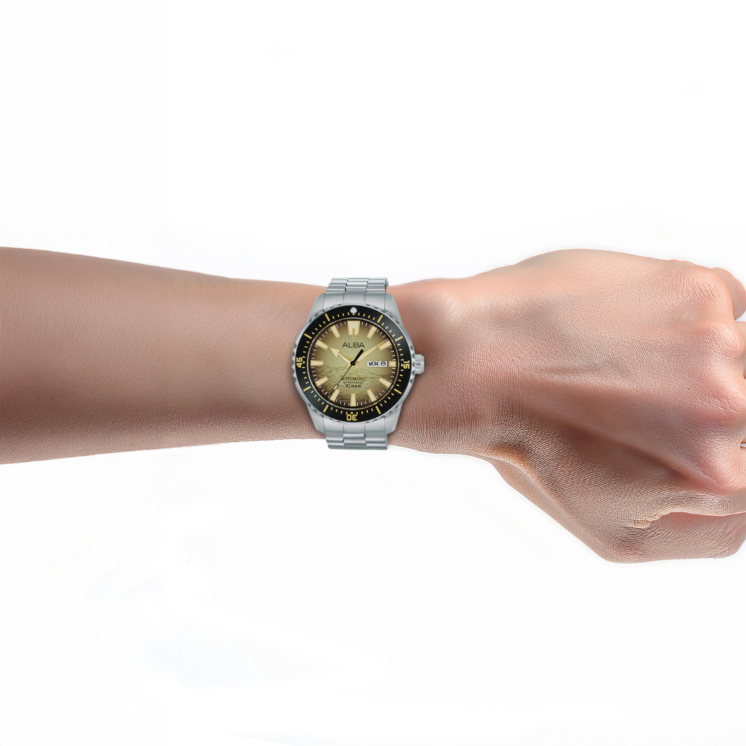 Alba AL4733X Mechanical Stainless Steel Men Watch combines a bold rotating bezel design with reliable mechanical performance for daily wear. Housed in a 44.5mm stainless steel case with a screw see-through back, it features a light champagne gradation dial with day and date display, enhanced by Lumibrite-coated hands and indexes for visibility in low light.