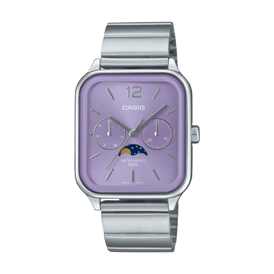 The Casio MTP-M305D-6AVDF Analog Standard Women Watch blends classic elegance with lunar-inspired design. Featuring a 34mm stainless steel case and bracelet, it showcases a striking purple dial with moon phase, date, and day sub-dials. Protected by mineral glass and powered by a reliable quartz movement with a 3-year battery life, this watch is water resistant up to 50 meters—offering both style and practicality for everyday wear.