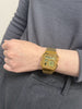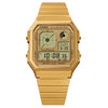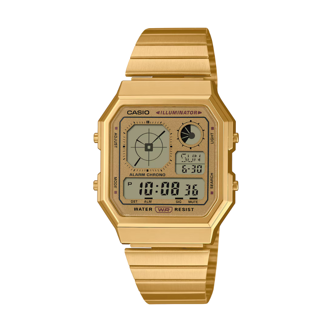 A digital watch featuring an analog-style clock display all wrapped up in the gadgety look you love. A retro-futuristic face is combined with stylish metallic colors and effective accent colors, showcasing a passion for gadgets. Boldly eclectic and practical, too. Packed with handy functions like water resistance for daily use, LED backlight, stopwatch, alarm, and more.
