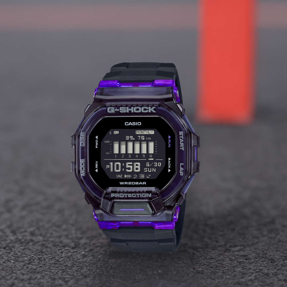 The Casio G-SHOCK GBD-200SM-1A6DR is a dynamic purple digital sports watch designed for performance and style. Featuring shock resistance and 200-meter water resistance, it’s perfect for outdoor activities and sports. Equipped with Bluetooth connectivity, this watch syncs with the CASIO WATCHES app to provide fitness tracking, including step count, running distance, and calories burned. The translucent purple bezel with contrasting accents adds a bold, modern look, while the lightweight design ensures comfort for all-day wear. Whether you’re working out or exploring the outdoors, this watch is built to perform.