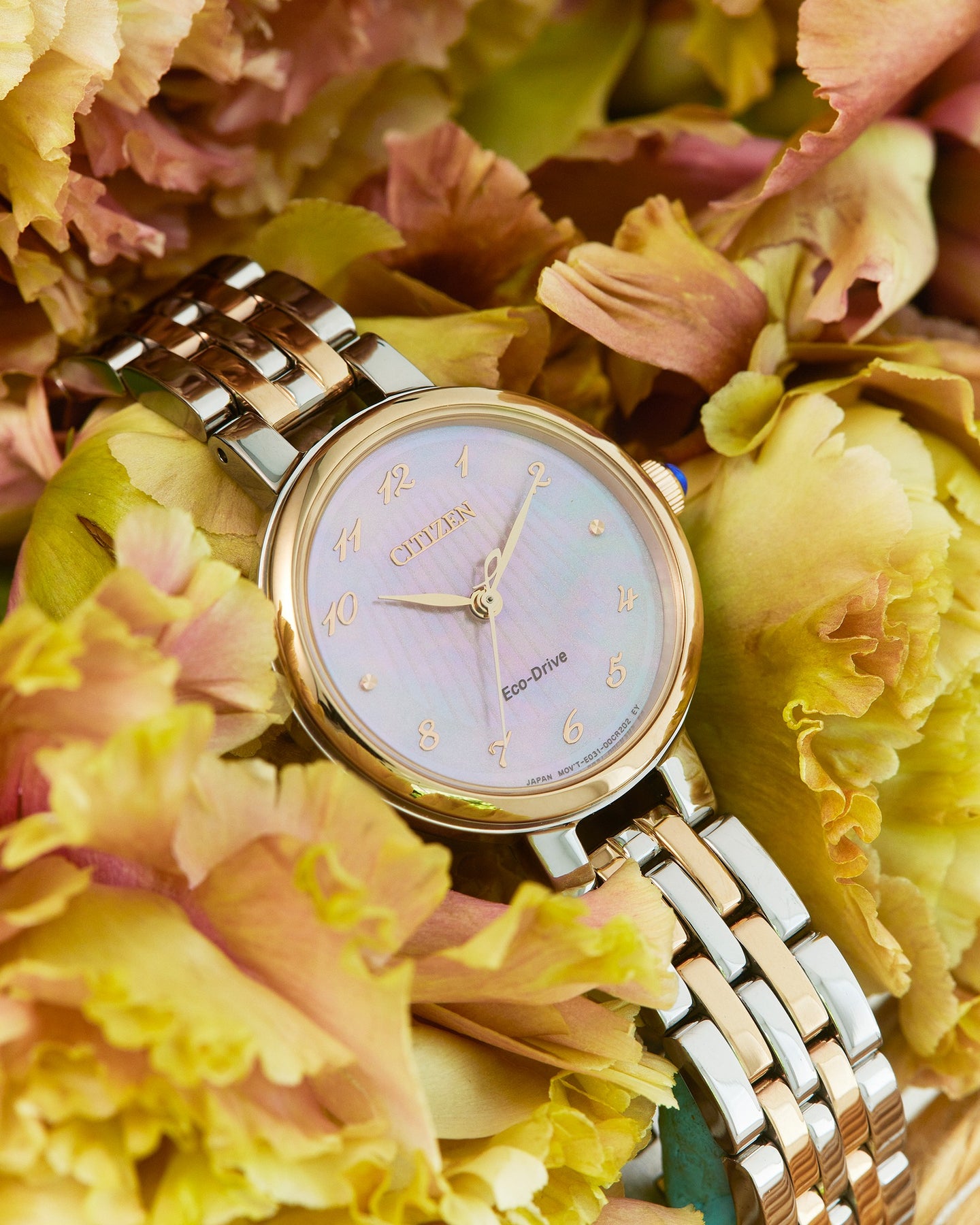 The CITIZEN L EM0996-84Y blends refined elegance with cutting-edge Eco-Drive technology. Its shimmering mother-of-pearl dial sits within a sleek 27.7mm silver-tone case, protected by scratch-resistant sapphire glass.