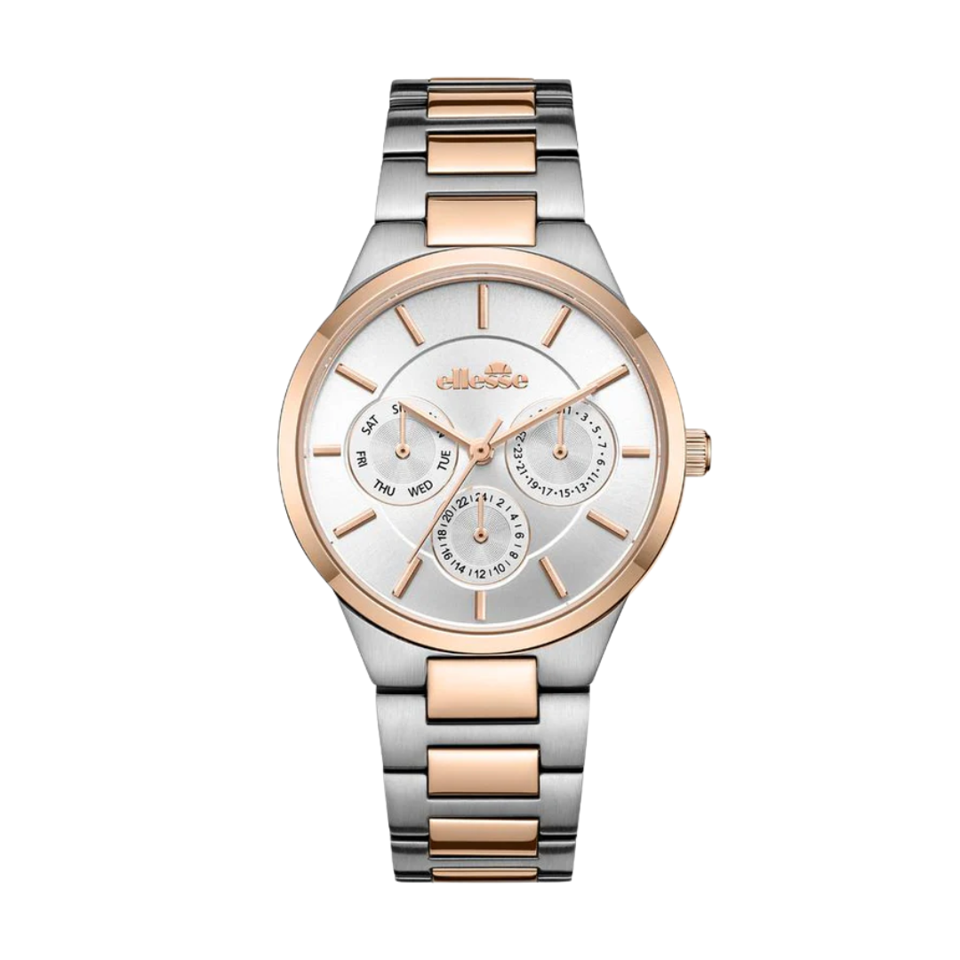 Ellesse W03-00856-003 Quartz Multi-Function Women Watch combines modern elegance with practical function for daily wear. Housed in a 34mm stainless steel case, it features a silver dial with multi-function subdials that enhance both style and readability. Powered by a quartz movement, this watch offers day, date, and 24-hour displays for added utility. With a mineral glass, 3 ATM water resistance, and a two-tones stainless steel bracelet, it’s built for stylish, everyday sophistication — perfect for the modern woman on the go.