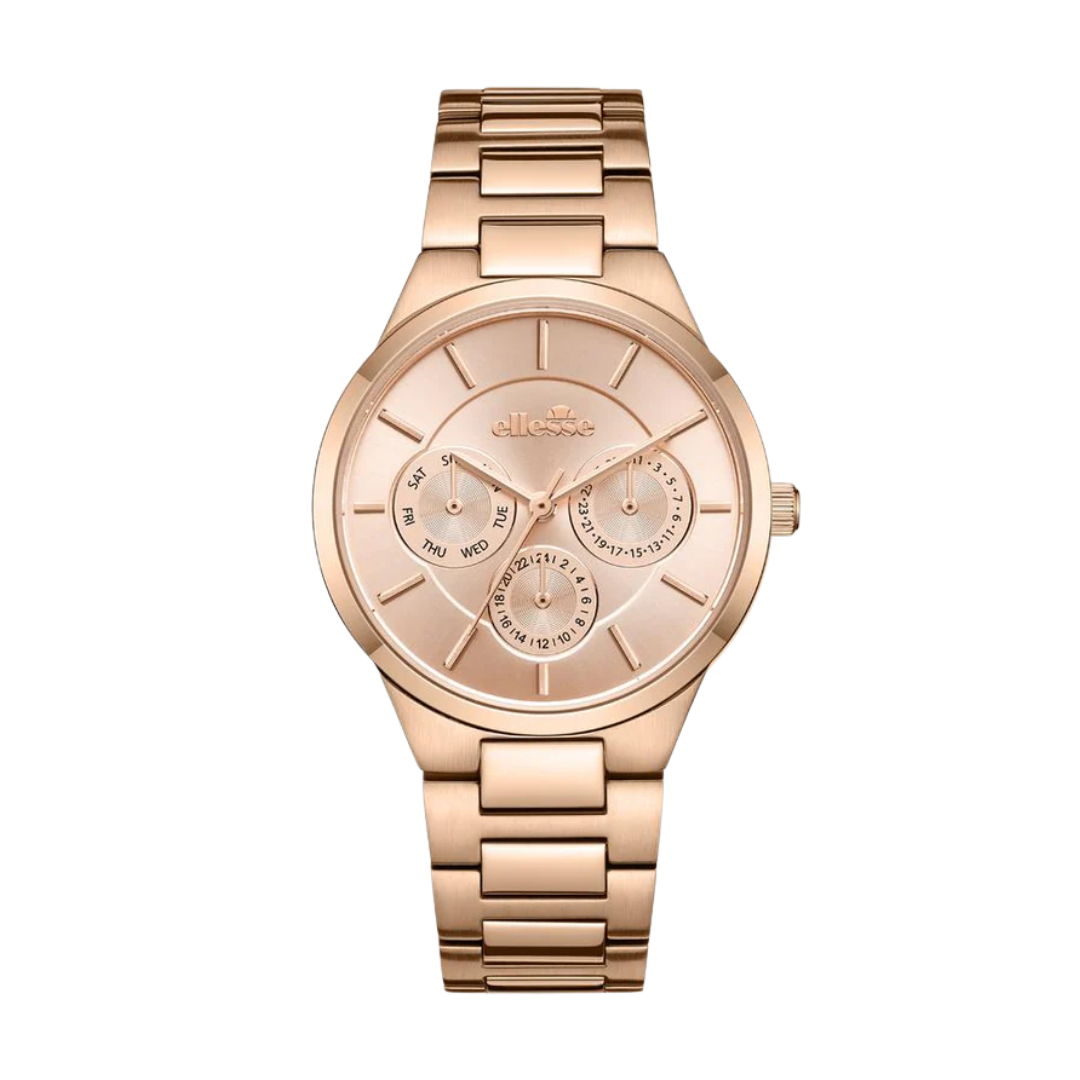 Ellesse W03-00856-004 Quartz Multi-Function Women Watch combines modern elegance with practical function for daily wear. Housed in a 34mm stainless steel case, it features a light rose gold dial with multi-function subdials that enhance both style and readability. Powered by a quartz movement, this watch offers day, date, and 24-hour displays for added utility. With a mineral glass, 3 ATM water resistance, and a light rose gold stainless steel bracelet, it’s built for stylish, everyday sophistication — perfect for the modern woman on the go.