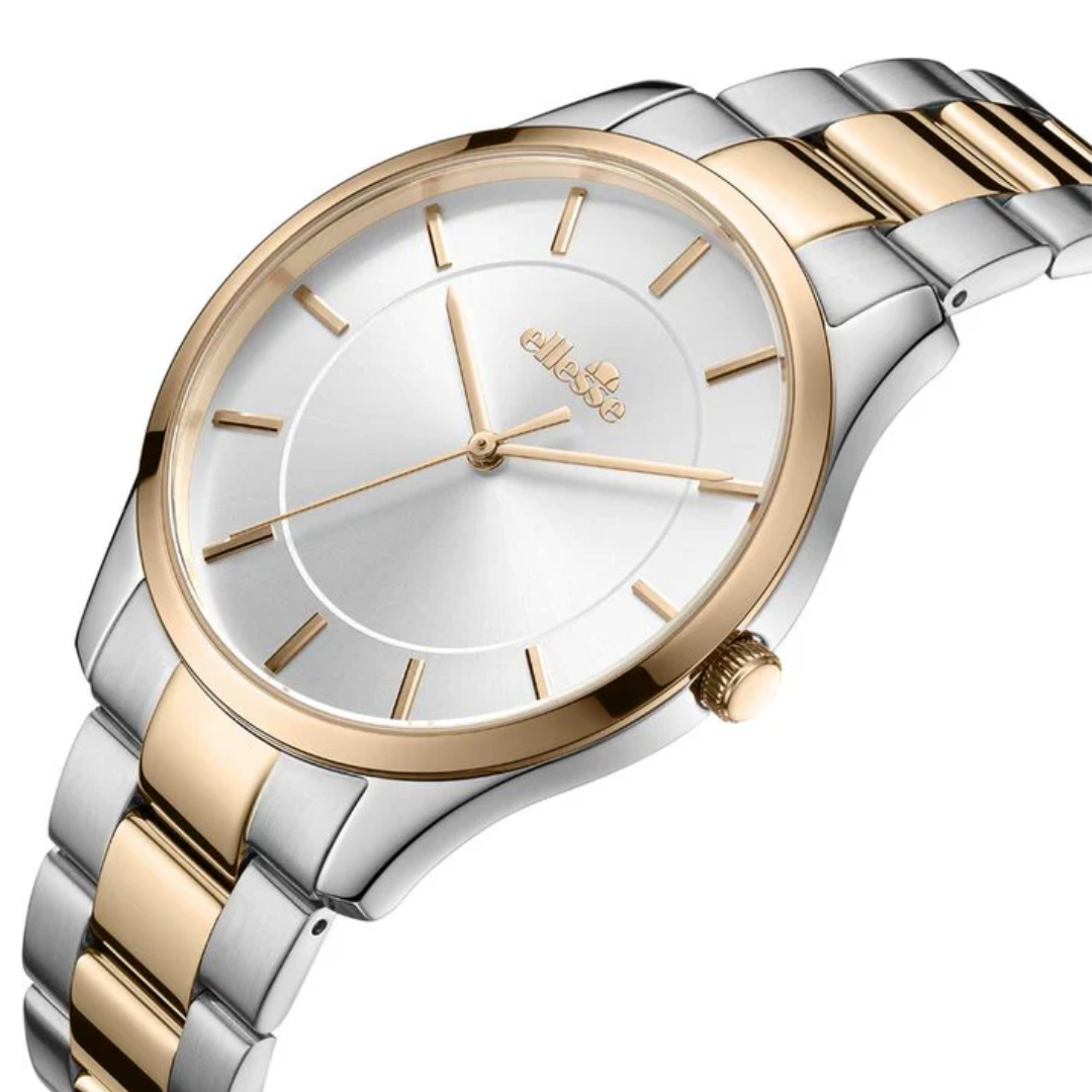Ellesse W03-00858-004 3 Hands Quartz Watch combines minimalist design with reliable performance for daily wear. Housed in a 40mm stainless steel case, it features a silver white dial with clean 3-hand layout for time-only precision. Powered by a quartz movement, this watch offers essential timekeeping with elegant simplicity. With mineral glass, 3 ATM water resistance, and a stainless steel bracelet in silver and light rose gold tones, it's built for both style and practicality — perfect for modern men seeking a refined, lightweight timepiece for everyday use.