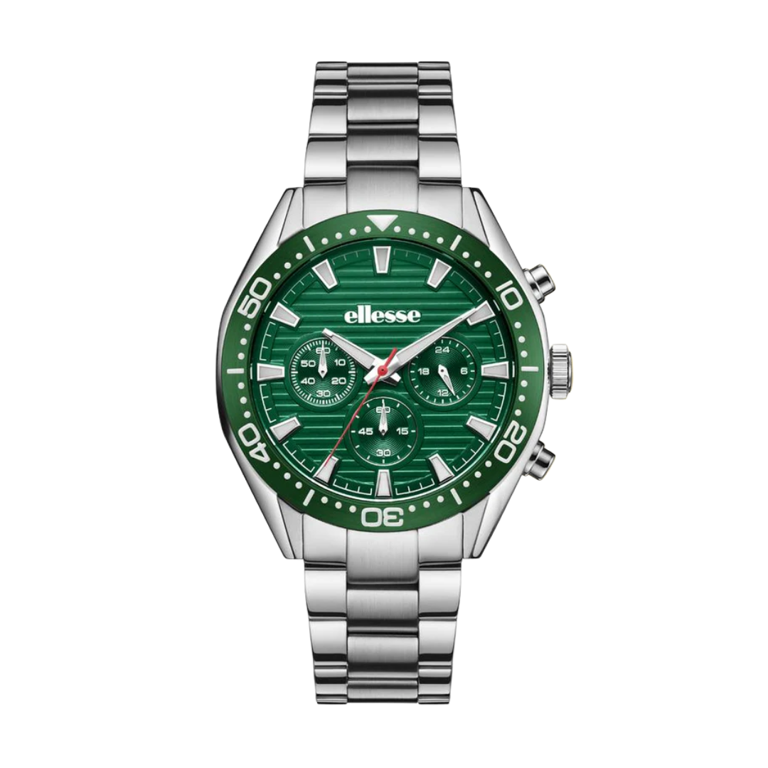 Ellesse W03-00861-003 Quartz Chronograph Men Watch combines a sporty chronograph style with reliable performance for daily wear. Housed in a 42mm stainless steel case, it features a green dial with three subdials, offering functional precision and modern appeal. Powered by a quartz movement, this watch offers chronograph functions ideal for time tracking. With mineral glass, 5 ATM water resistance, and a sleek silver stainless steel strap, it's built for both style and practicality — perfect for the modern professional with an active lifestyle.