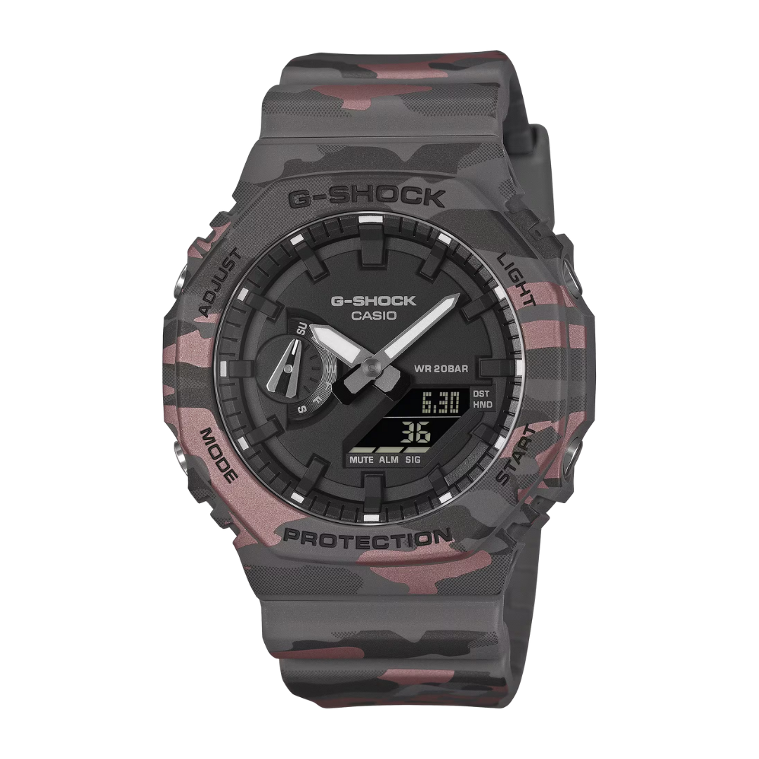 Stand out with the GA-2100CM-8ADR, featuring G-Shock's exclusive camouflage pattern that cleverly conceals the iconic G-mark. This analog-digital timepiece combines bold urban style with legendary G-Shock toughness.