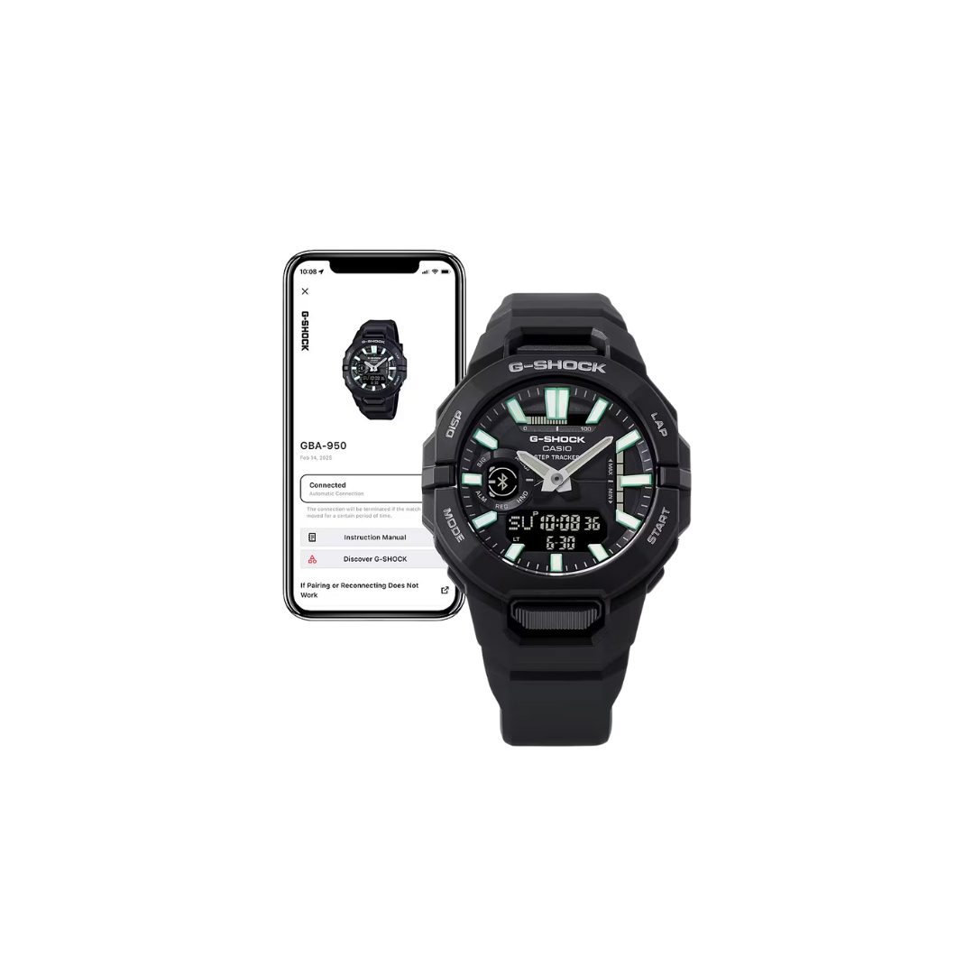 Train smarter with the Casio G-Shock G-Squad Sports GBA-950-1ADR Analog-Digital Black Watch, a Bluetooth-enabled fitness companion built for urban sports. Designed with bio-based resin for sustainability, this shock-resistant watch features step tracking, calorie and distance measurement, Auto Lap timing, and smartphone GPS syncing for precise distance correction. The unique origami-engineered band ensures a snug, comfortable fit, while 200-meter water resistance and double LED illumination deliver durability and visibility in every workout. A perfect blend of advanced training functions and iconic G-SHOCK toughness.