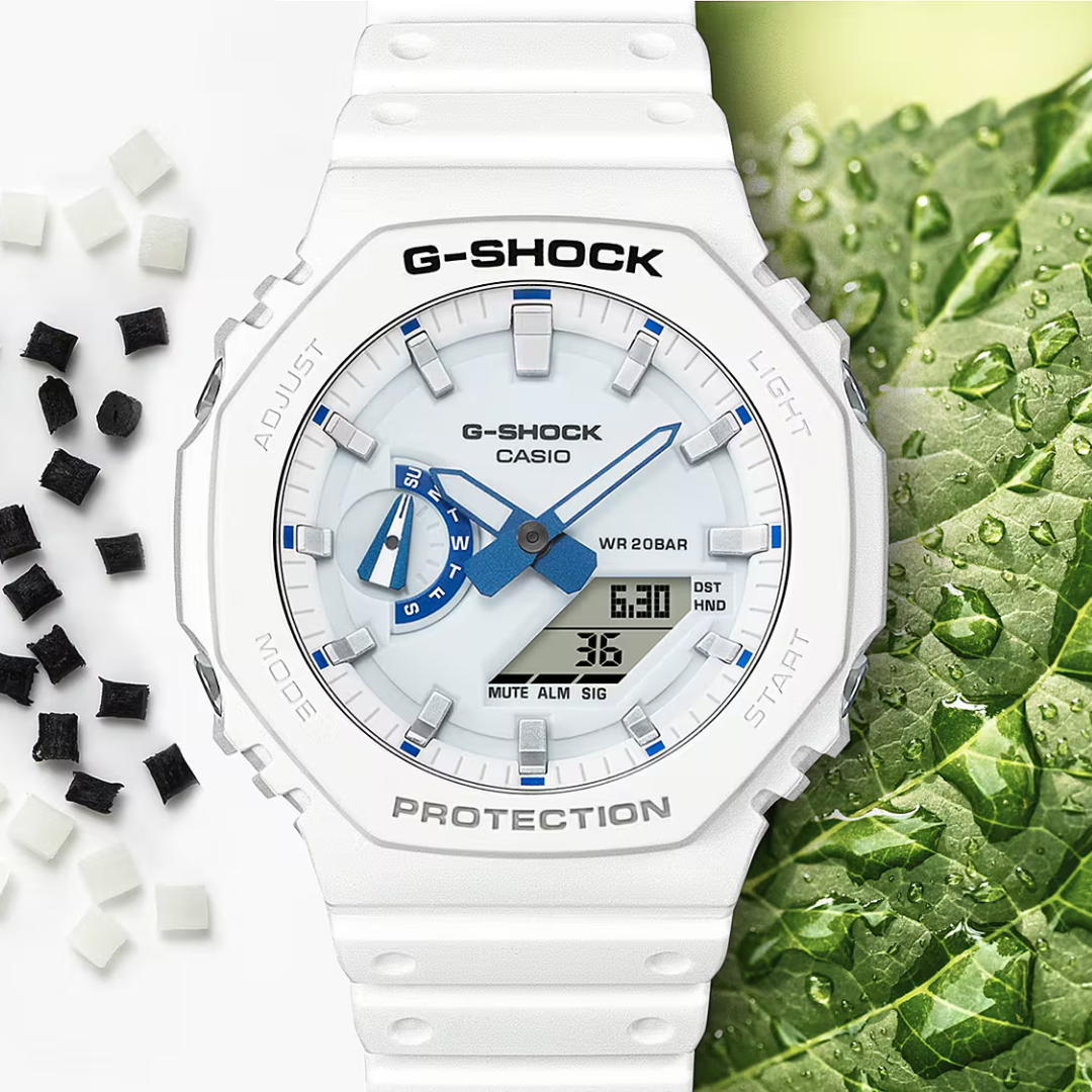 The Casio G-Shock GA-2100HDS-7ADR Standard Analog-Digital White Watch draws inspiration from the summer seas with a fresh white-and-blue color scheme. Its phosphorescent blue dial glows at night, evoking the magical shimmer of bioluminescent plankton under the waves. Built with G-Shock’s Carbon Core Guard structure, this slim and lightweight model is shock-resistant, water-resistant up to 200 meters, and powered by a 3-year battery. Packed with practical features including world time, stopwatch, countdown timer, 5 alarms, and double Super Illuminator LED lights, it’s a versatile timepiece that flows easily from the beach to everyday wear.