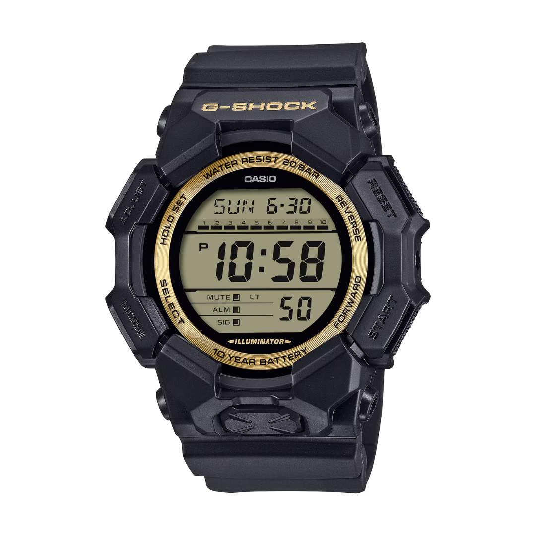 The Casio G-Shock GD-010GB-1A9DR Standard Digital Black Watch makes a bold statement with its black-and-gold design. Featuring a glossy black bio-based resin case accented with gold vapor deposition details and mirrored textures, it delivers a sleek yet powerful aesthetic. Built tough with G-Shock’s carbon core guard structure, this large-case digital watch is shock-resistant, water-resistant up to 200 meters, and powered by a 10-year battery. Functional features include world time, stopwatch, countdown timer, 5 alarms, and Super Illuminator LED backlight, making it both stylish and reliable for everyday wear.