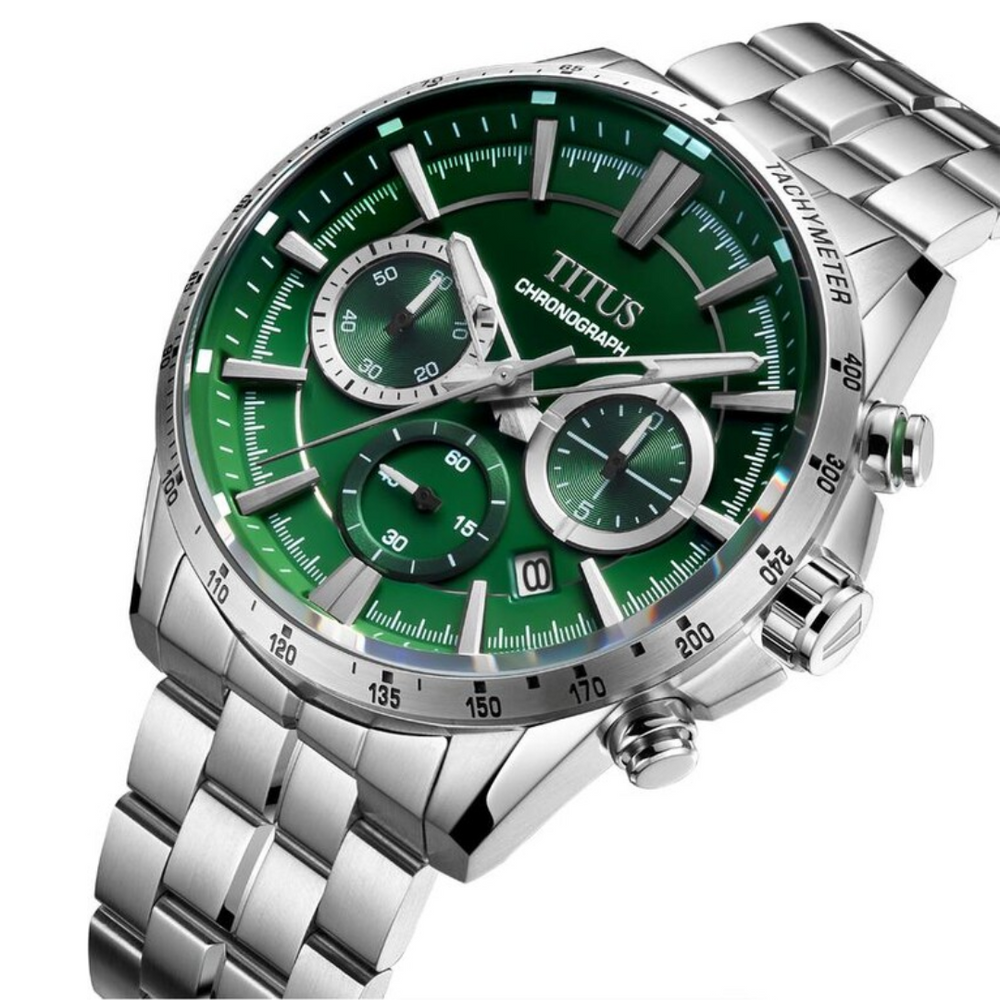 The Solvil et Titus Saber W06-03337-012 Chronograph Quartz Men Watch features a robust 44.2mm stainless steel case with a gradient dark-to-light green dial for a bold modern look. Built with chronograph functionality and powered by a reliable quartz movement, it ensures precise timekeeping for everyday wear. Protected by mineral glass and paired with a stainless steel bracelet, this watch offers 10 ATM water resistance, combining durability, practicality, and contemporary style.
