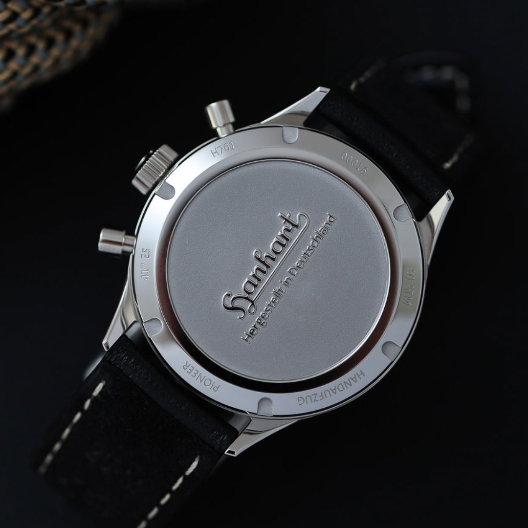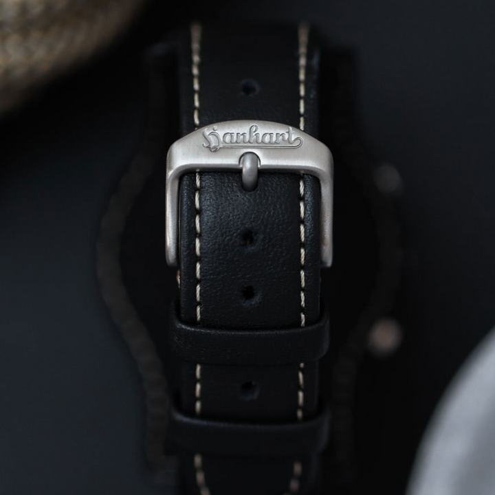 On the wrist, a black calfskin strap with a waistband-style carpet pad ensures a high level of comfort from day one. The Alcantara lining also promises a particularly pleasant feel against the skin. A stainless steel pin buckle with the historic Hanhart logo provides a secure hold.