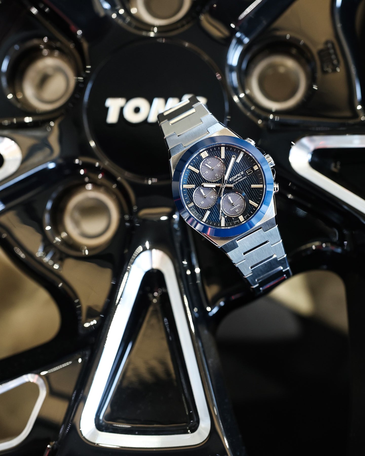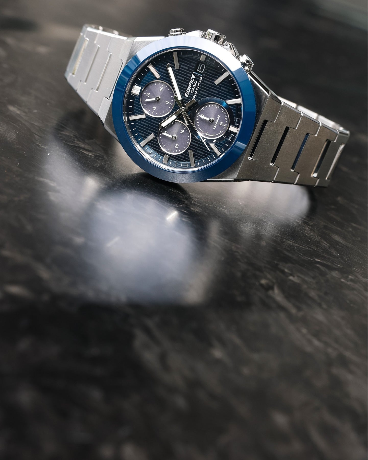 The Casio Edifice EFS-S650D-2ADF Solar Chronograph Men Watch features the first ceramic bezel in the Edifice collection, combining durability with refined design. Its polished blue ion plated ceramic bezel offers exceptional scratch resistance while reflecting the luxury of sports car styling. A stainless steel case and band with fine mirror and hairline finishing complement the patterned blue dial, delivering a modern, versatile look. Powered by solar energy, this chronograph includes a stopwatch function, sapphire crystal protection, and 100-metre water resistance — a timepiece crafted for style and endurance.