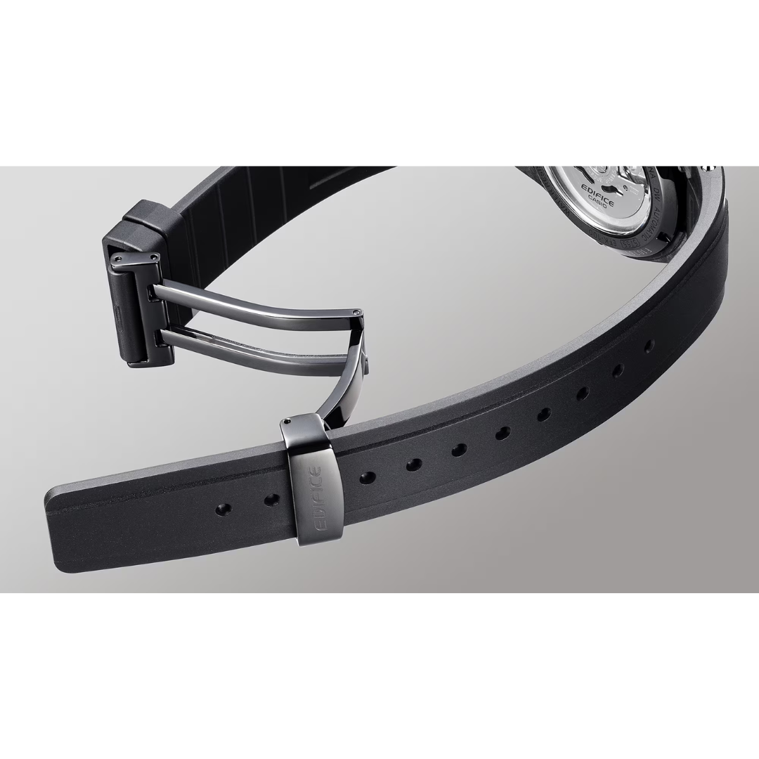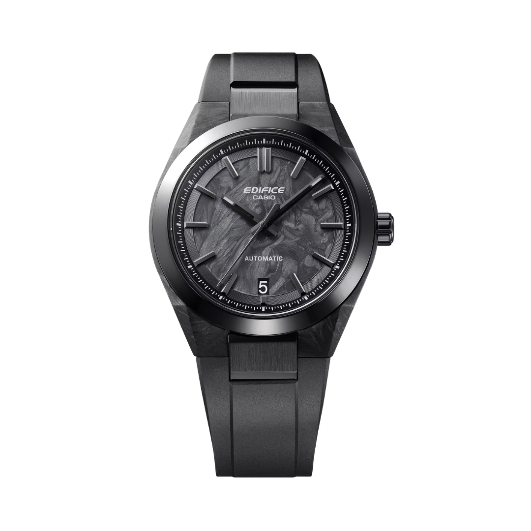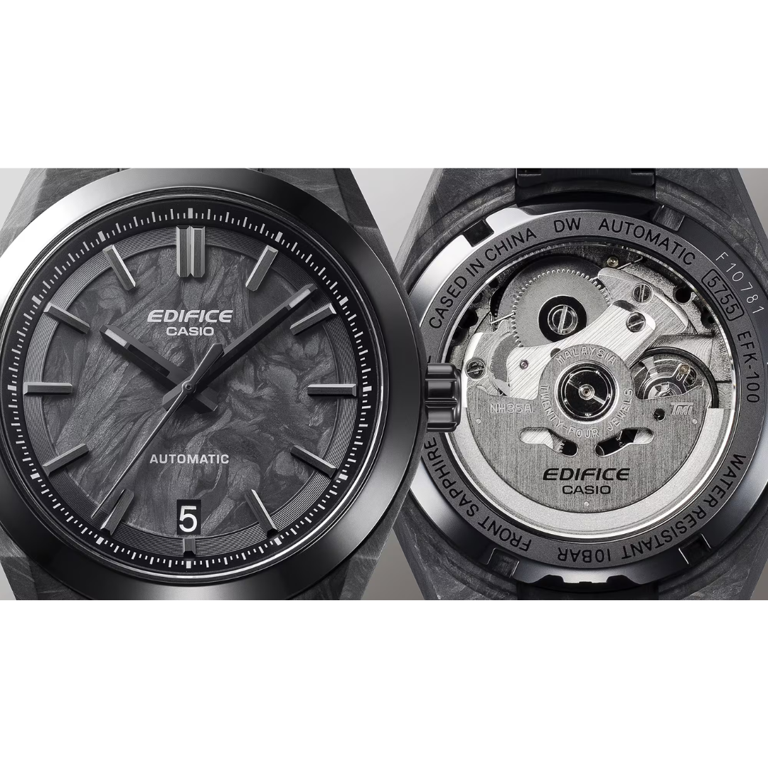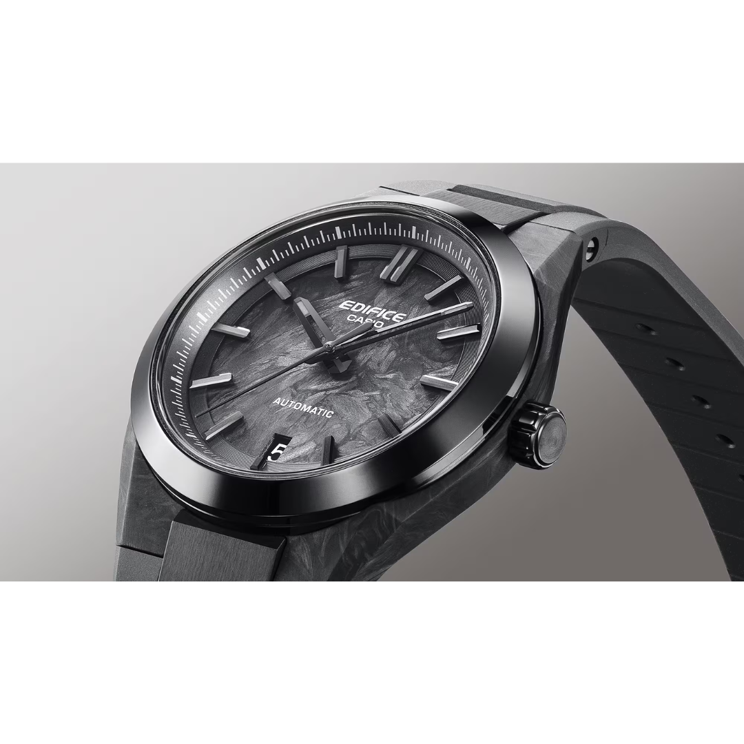 CASIO Edifice EFK-100XPB-1ADR Automatic Forged Carbon Men Watch combines cutting-edge materials and bold design with mechanical performance. Housed in a 40mm forged carbon case with a black ion-plated bezel, it features a forged carbon dial, echoing the lightweight, high-strength materials used in premium sports cars.