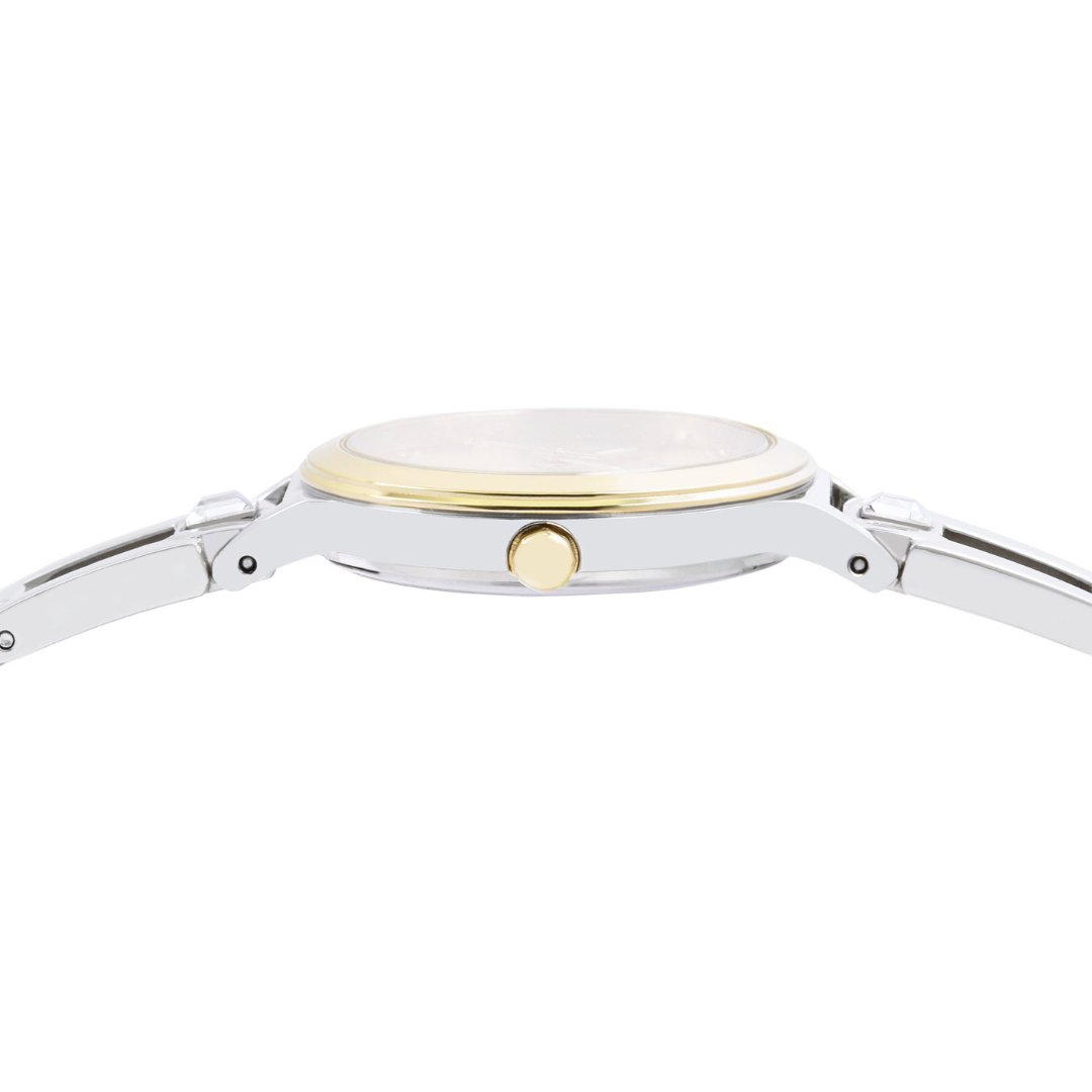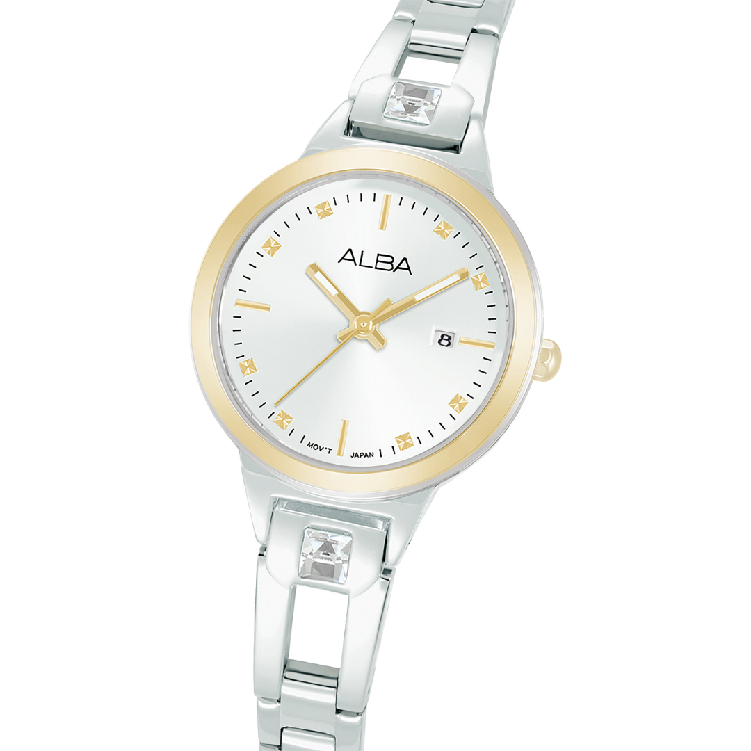 The Alba AH7EH8X Fashion Quartz Women Watch features a 30mm stainless steel case with a silver white dial for a soft, feminine style. Designed with a stainless steel solid and side wrapped bracelet, it offers date display, 3-hand timekeeping, and 5-bar water resistance. Mineral crystal glass provides durability, making it perfect for both daily wear and special occasions.