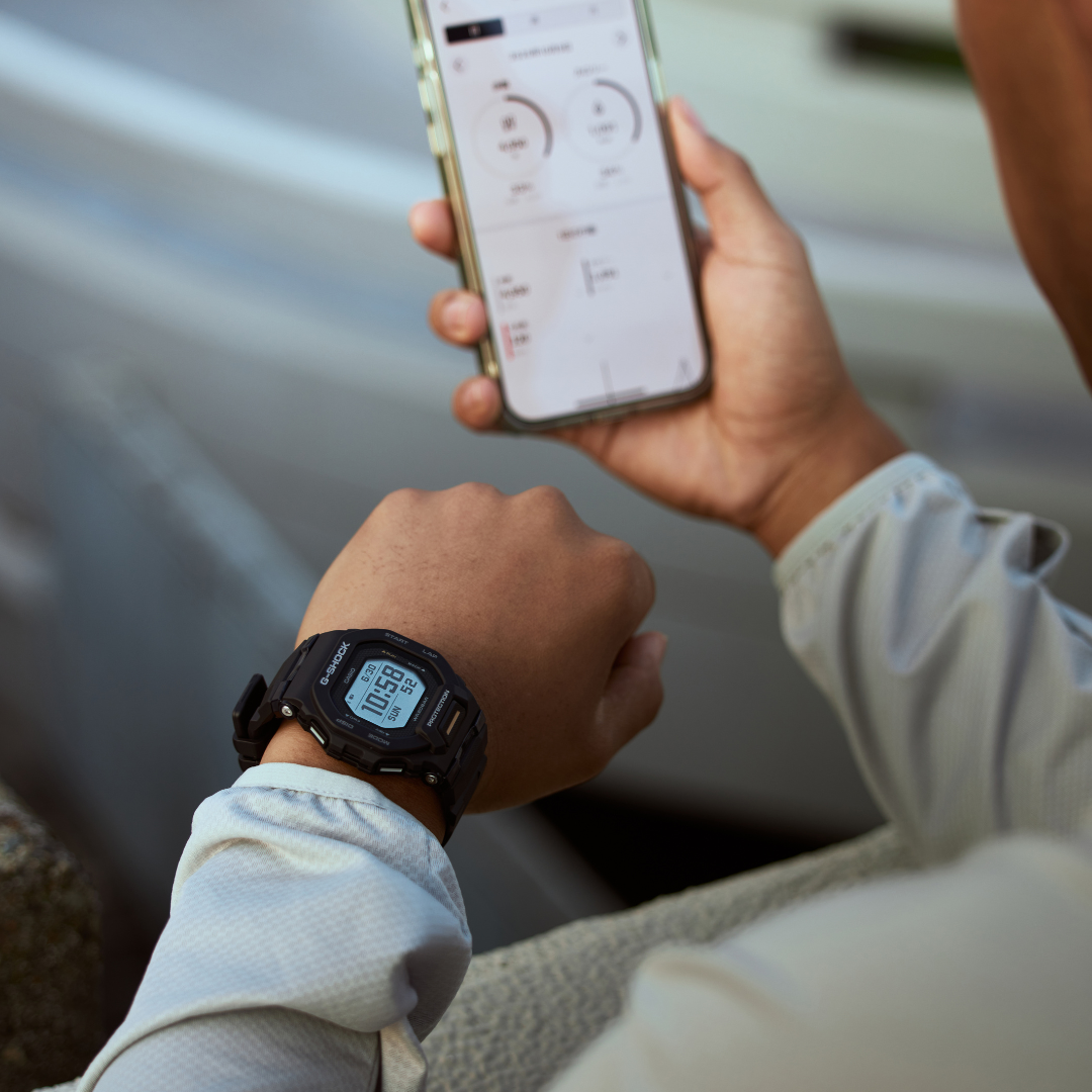Stay fit, stay connected. The Casio G-Shock GBD-200-1A1DR from the G-Squad series combines tough G-Shock durability with advanced sports functionality. Designed for active lifestyles, this watch offers Bluetooth connectivity, training data tracking, and smartphone notifications, all in a lightweight resin case weighing just 58g.