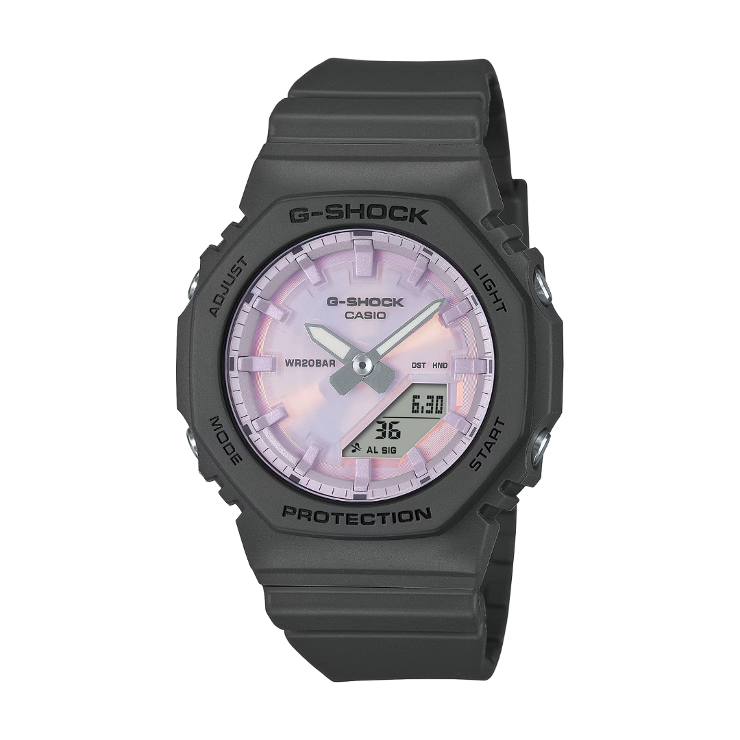The Casio G-Shock GMA-P2100PC-1ADR Analog-Digital Women Watch elevates your look with a polarized dial that shimmers in vibrant colors from every angle. Glossy indexes enhance its brilliance, while the matte-textured black bezel and band create a chic contrast. Made with bio-based resin to support sustainability, this compact 46mm model is tough yet stylish. Built with G-Shockâs shock resistance and 200-meter water resistance, it also offers world time, stopwatch, countdown timer, 5 alarms, and double Super Illuminator LED lightsâmaking it the perfect fusion of street fashion and functionality.