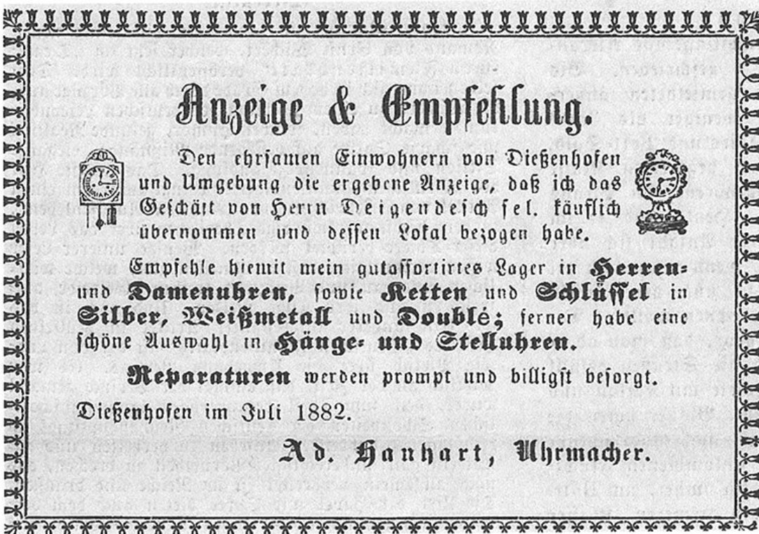 The sun glows red in the evening sky over the little town of Diessenhofen, located on the River Rhine in northeast Switzerland, as the watchmaker Johann A. Hanhart sits down, takes out a pen and paper and drafts an announcement. He “respectfully informs the worthy residents of Diessenhofen and surroundings” that he has purchased a business and its premises at the town’s Hauptstrasse with the intention of opening a watch shop.