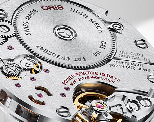 This movement combines a 10-day power reserve, Oris’s patented non-linear power reserve indicator, a date indication and, for the first time, a 24-hour second time zone with half-hour indication. No other mechanical watch in Swiss watchmaking combines these functions in a single watch.