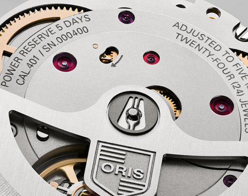 Oris Calibre 401 is an automatic movement with a five-day power reserve, high levels of anti-magnetism, 10-year recommended service intervals and a 10-year warranty.