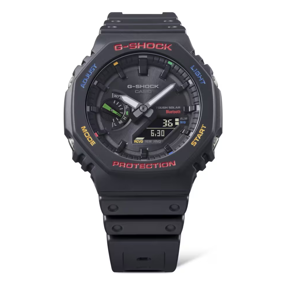Who says you can’t be playful and tough? Introducing the rugged G-SHOCK dressed up with splashes of colorful accents — ready to party and play. The watch is based on the GA-B2100, which maintains the distinctive octagonal form of the GA-2100 and has handy functions like Smartphone Link and Tough Solar charging. It also employs the Carbon Core Guard structure to preserve a similar fit on the wrist as the original model.