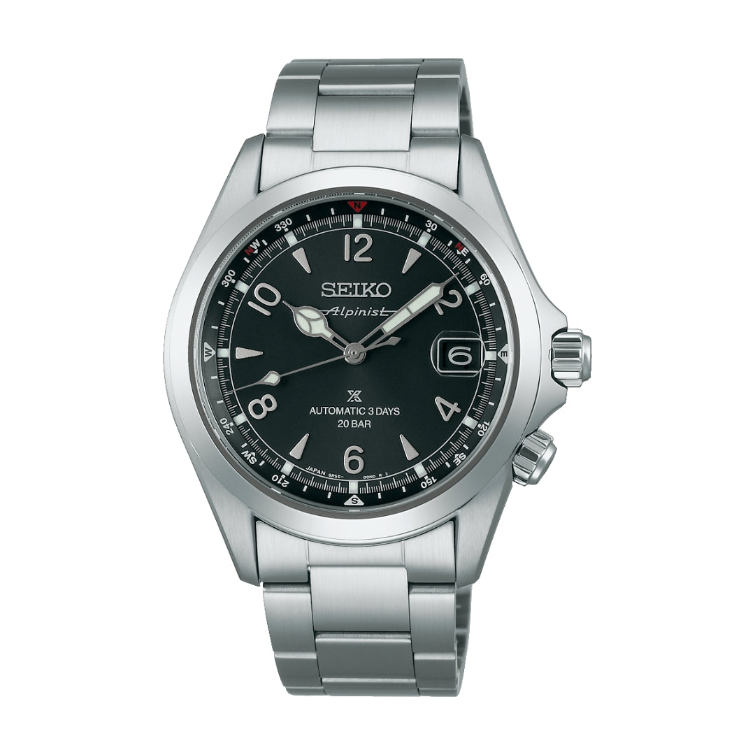 The Seiko Prospex SPB505J1 Alpinist Automatic Men Watch pays homage to the original 1959 Alpinist, created for Japan’s mountain explorers. Beneath the sapphire crystal, the elegant black dial features cathedral-style hands, Arabic numerals, and the classic Alpinist logo from Seiko’s earliest Laurel models. The stainless steel case, finished with a super-hard coating, enhances both durability and luster, while the caseback bears the signature “Mountain Device” emblem symbolizing its field-ready spirit. Powered by the in-house 6R55 automatic movement with a 72-hour power reserve, visible through the exhibition caseback, this Alpinist blends rugged adventure heritage with timeless craftsmanship.